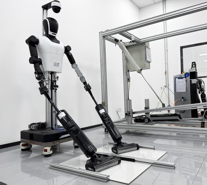 По соседству человекоподобный робот имитирует те же самые действия. Он способен выдержать словно бесконечную нагрузку, поэтому поставлен оценивать количество циклов, которые способен выдержать пылесос.