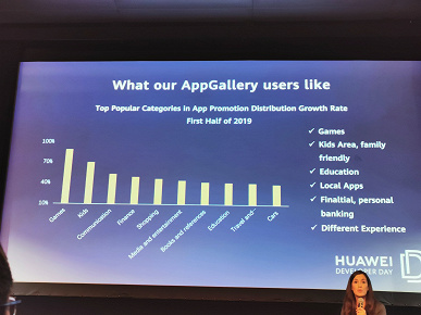 По исследованиям Huawei, основной вид контента, который потребляют пользователи на своих мобильных устройствах — игровой. Значительная часть каждой презентации адресовалась именно разработчикам игр. Декларировалась более простая среда разработки, монетизации, встроенных покупок, вплоть до виртуальных устройств платежа.