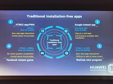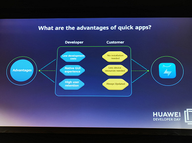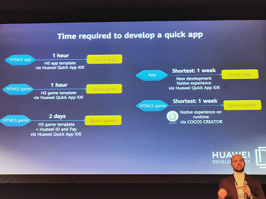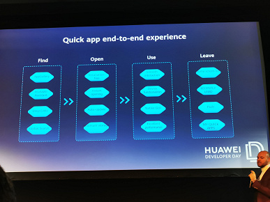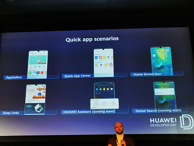 Установка приложений Quick App подразумевается не только из магазина, но и с помощью системы поиска, рекомендаций и Huawei Assistant. Вопроса безопасности подобных решений Roland Bartella в докладе не касался. Менеджер по продуктам европейского отделения мобильных сервисов лишь отмечал преимущество Quick App с точки зрения скорости загрузки, экономии свободного пространства на диске и количества запущенных приложений за прошедший период. В графе Security при этом было отмечено просто «Supported».
