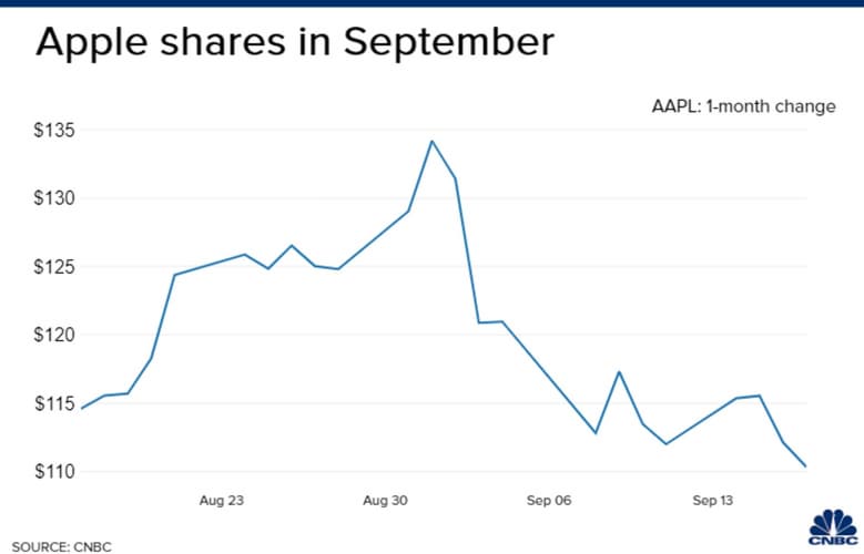 В августе Apple стала первой американской компанией и второй компанией в истории с рыночной капитализацией в 2 трлн долларов. Эта отметка была взята намного быстрее, чем прогнозировали аналитики, и рост продолжился. По состоянию на 1 сентября капитализация превысила 2,3 трлн долларов, но это оказался максимум, после чего акции начали дешеветь.