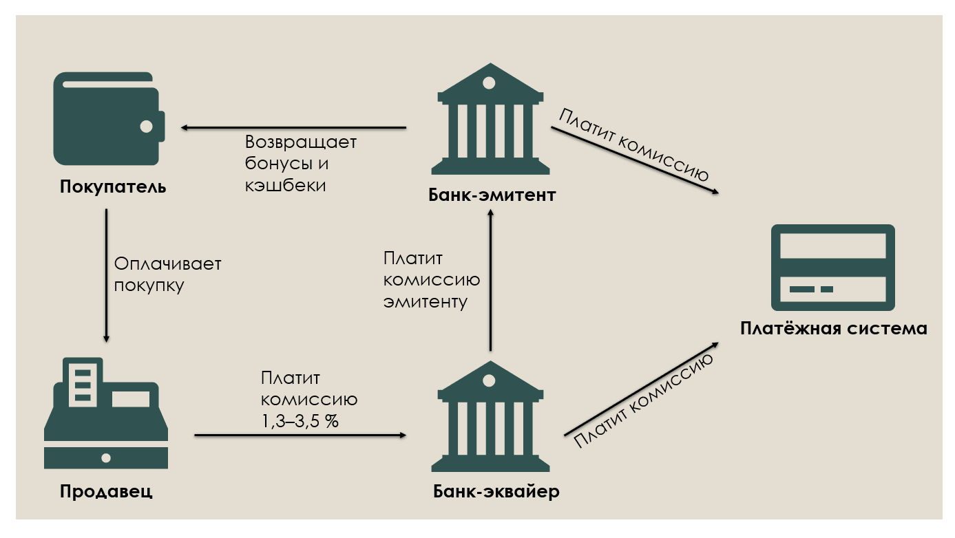 А вот неакционные вознаграждения потребитель получает… от самого себя. Причем отдает он больше, чем получает. Всё дело в комиссиях, уплачиваемых торговой точкой своему банку-эквайеру за обработку карт. Последний же часть полученной суммы оставляет себе за работу, а остальное перечисляет платежной системе и банку-эмитенту. И лишь часть последней суммы эмитент может отдать непосредственно держателю карты.