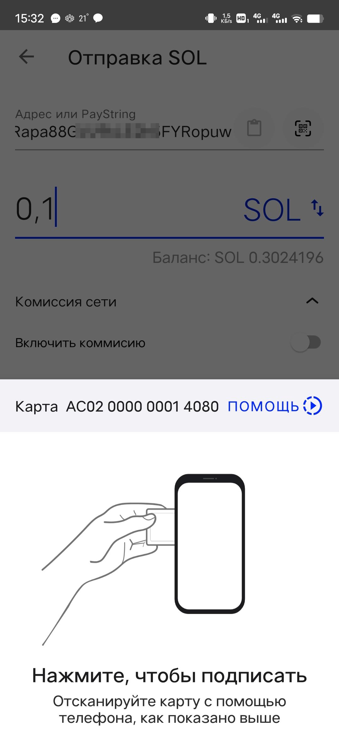 В итоге отправка токенов и цифровых монет происходит так же, как обычно, с тем лишь отличием, что для проведения транзакции придется приложить карту Tangem.