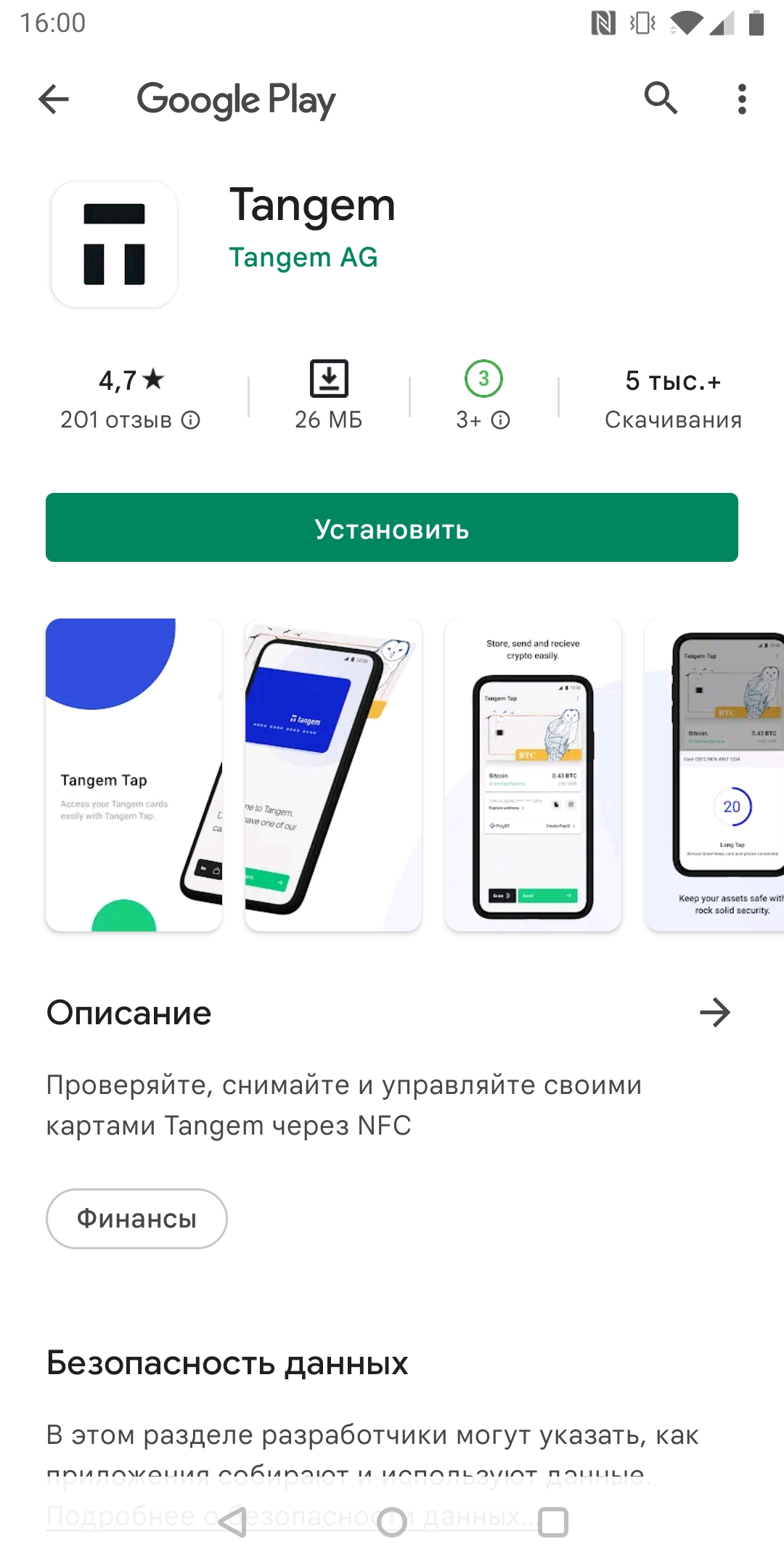 Чтобы «завести» себе криптокошелёк, понадобится установить приложение Tangem для iOS или Android. Лучше не искать приложение в App Store или Play Market, а просто приложить одну из карт к своему смартфону. Страница с нужным приложением будет открыта автоматически, в зависимости от ОС вашего смартфона.
