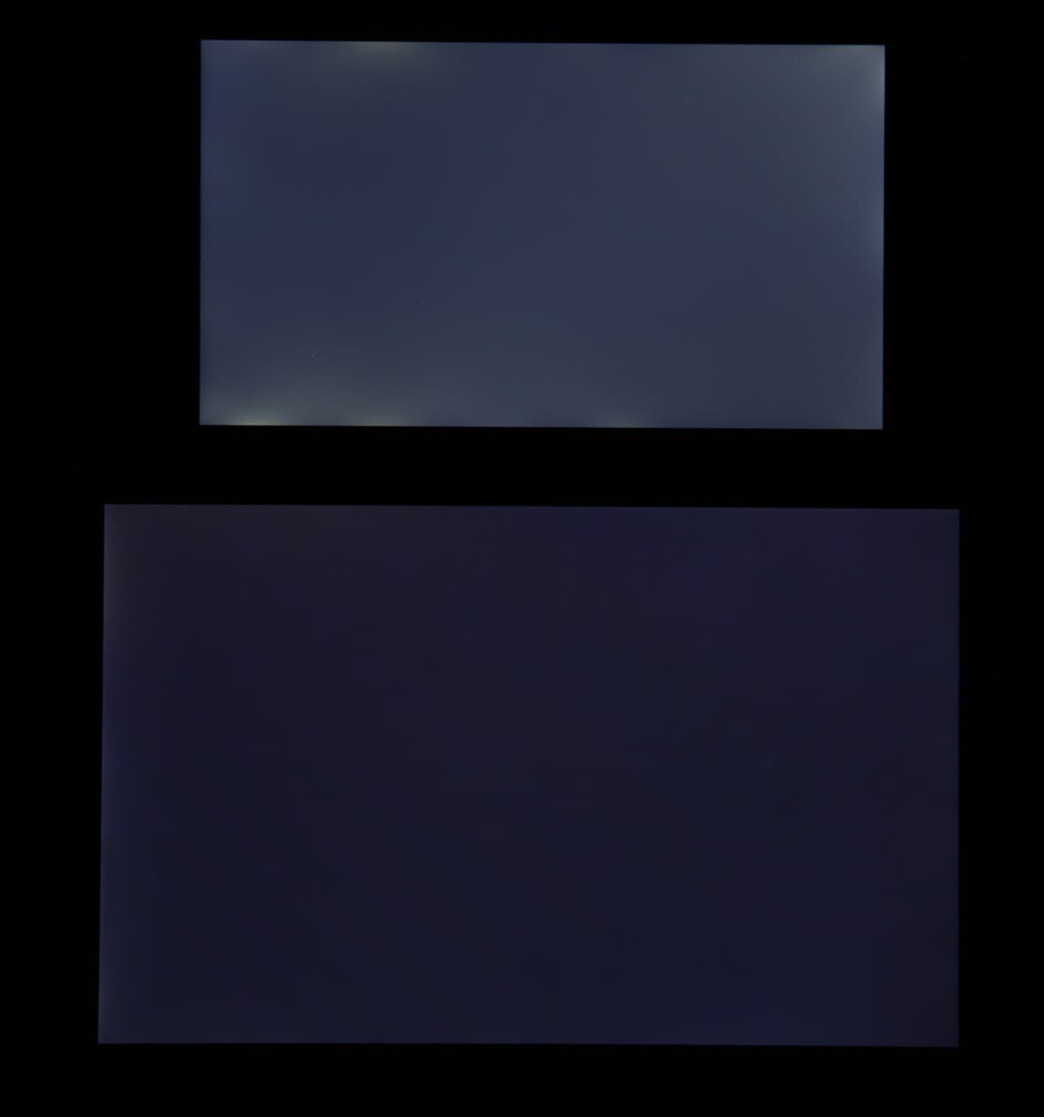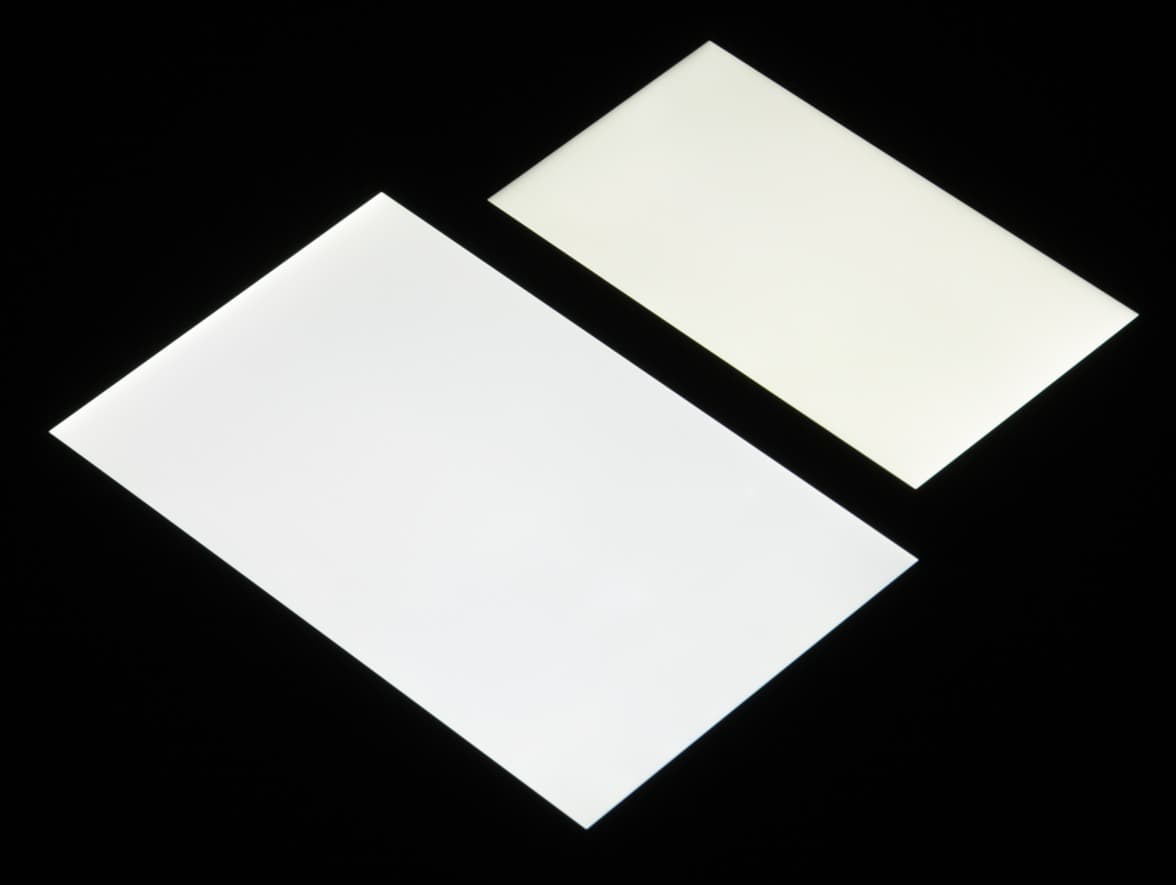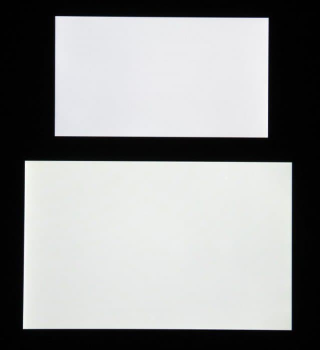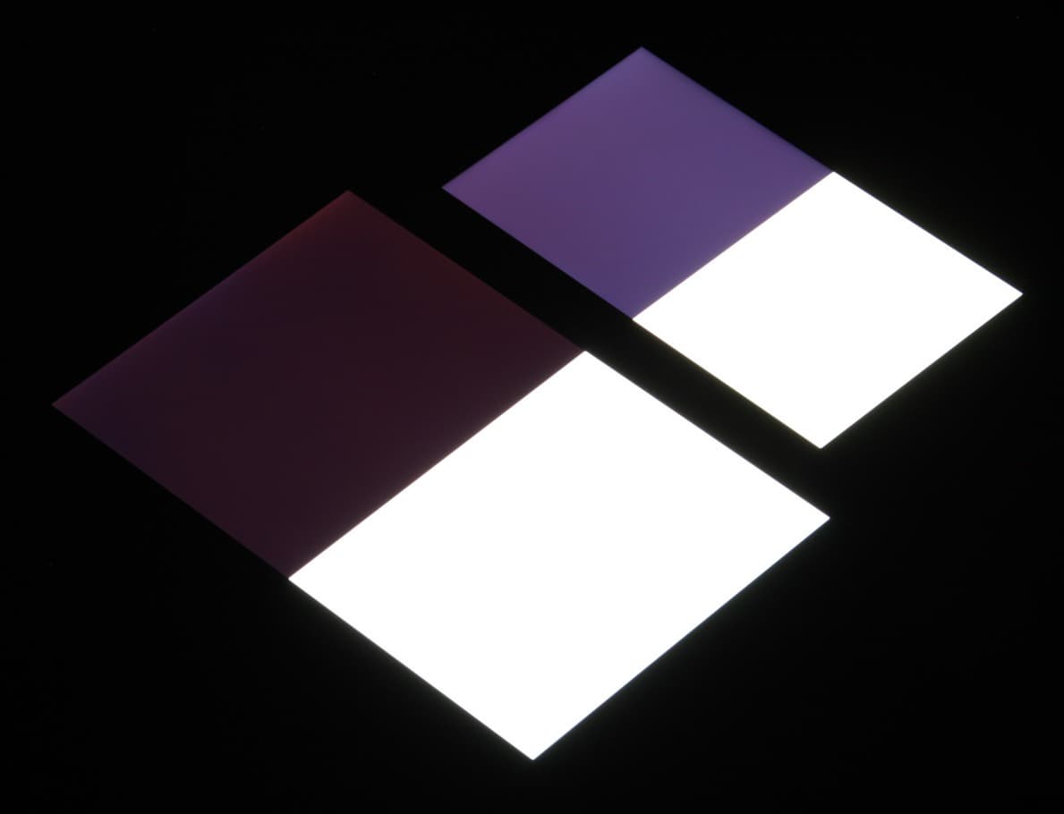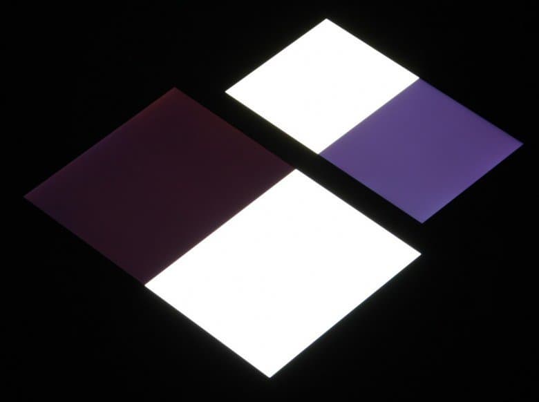 Яркость под углом у экранов уменьшилась (как минимум в 5 раз, исходя из разницы в выдержке), и уменьшилась примерно одинаково. Черное поле при отклонении по диагонали сильно высветляется и приобретает фиолетовый оттенок. Фотографии ниже это демонстрируют (яркость белых участков в перпендикулярном плоскости экранов направлении одинаковая!):