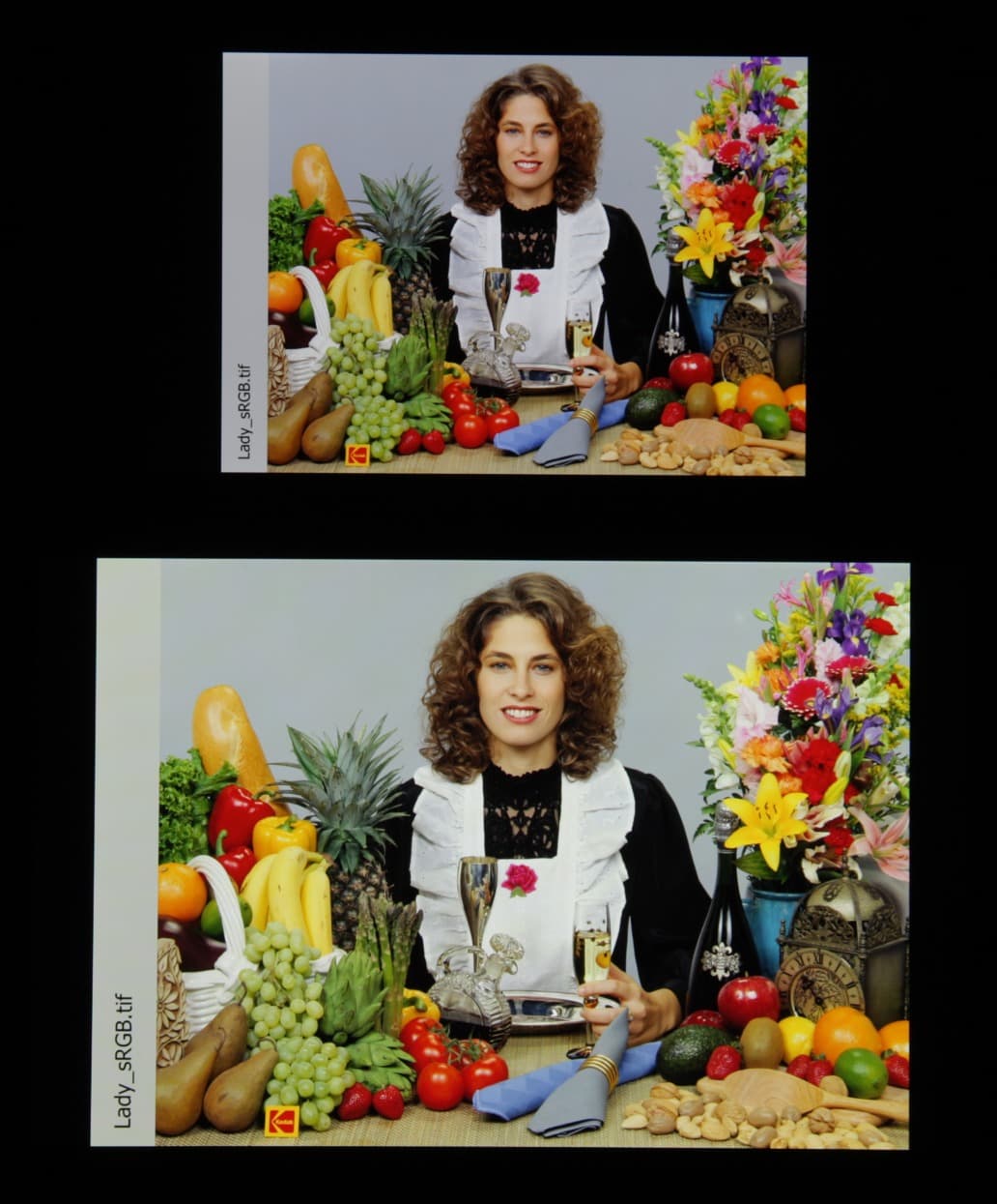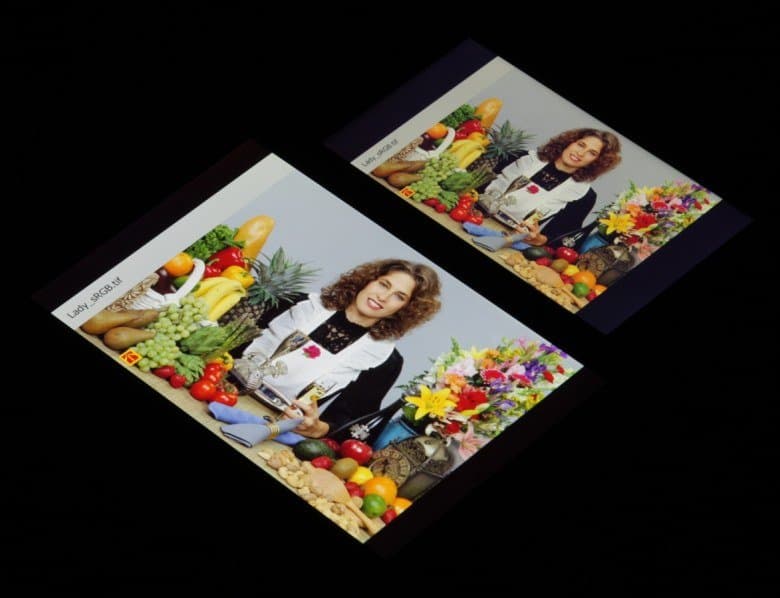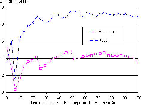 В итоге цвета имеют естественную насыщенность и оттенок. Баланс оттенков на шкале серого хороший, так как цветовая температура не сильно выше стандартных 6500 К и отклонение от спектра абсолютно черного тела (ΔE) ниже 10, что для потребительского устройства считается приемлемым показателем. При этом оба параметра мало изменяются от оттенка к оттенку — это положительно сказывается на визуальной оценке цветового баланса. (Самые темные области шкалы серого можно не учитывать, так как там баланс цветов не имеет большого значения, да и погрешность измерений цветовых характеристик на низкой яркости большая.)