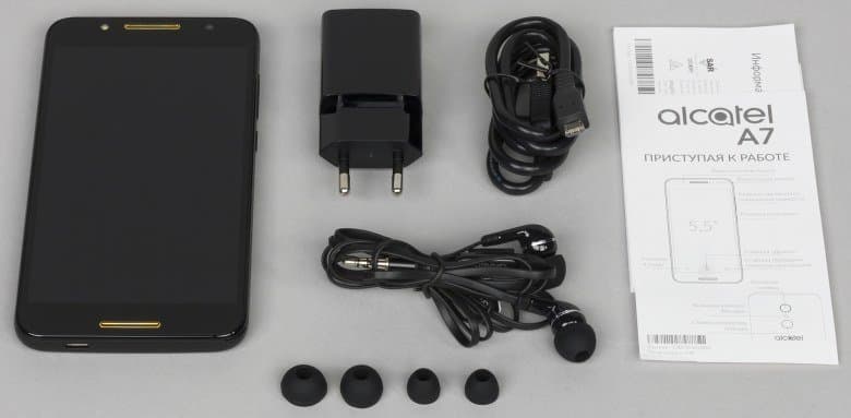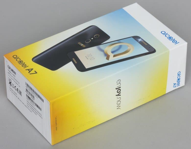 Alcatel A7 поставляется в продажу в просто оформленной упаковке без изысков, выполненной из твердого картона. Коробка достаточно крупная, вмещает в себя достойный набор сопутствующих аксессуаров.
