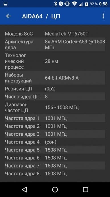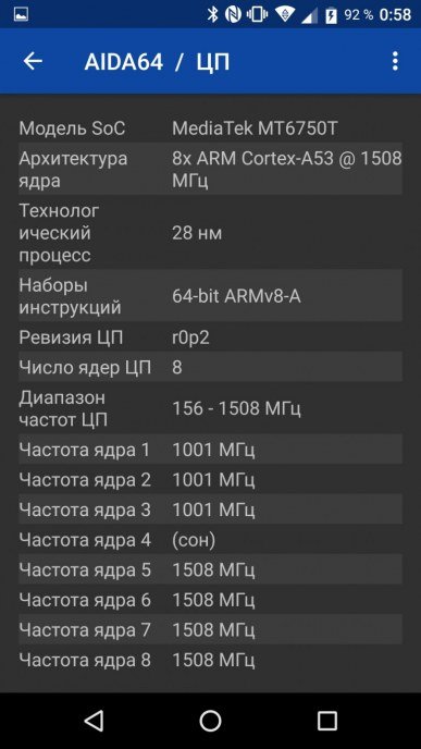 - SoC MediaTek MT6750Т, 8×ARM Cortex-A53 @1/1,5 ГГц