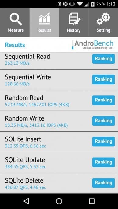 Результаты теста AndroBench на скорость работы с памятью: