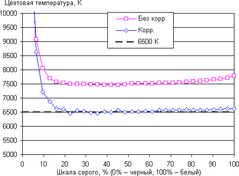 На графиках выше кривые Без корр. соответствуют результатам без какой-либо коррекции цветового баланса, а кривые Корр. — данным, полученным после сдвига ползунка коррекции цветовой температуры в приведенное на картинке положение. Видно, что изменение баланса соответствует ожидаемому результату, так как цветовая температура приблизилась к стандартному значению, при этом значение ΔE возросло, но все же осталось ниже 10. Выполнять такую коррекцию можно, но особого резона в этом нет.
