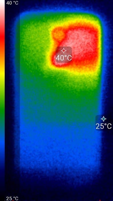 Нагрев локализован в верхней левой части аппарата, что, видимо, соответствует расположению микросхемы SoC. По данным теплокамеры, максимальный нагрев составил 40 градусов (при температуре окружающего воздуха в 24 градуса), это относительно немного.