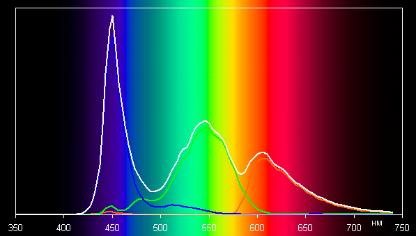Спектры показывают, что светофильтры матрицы в умеренной степени подмешивают компоненты друг к другу: