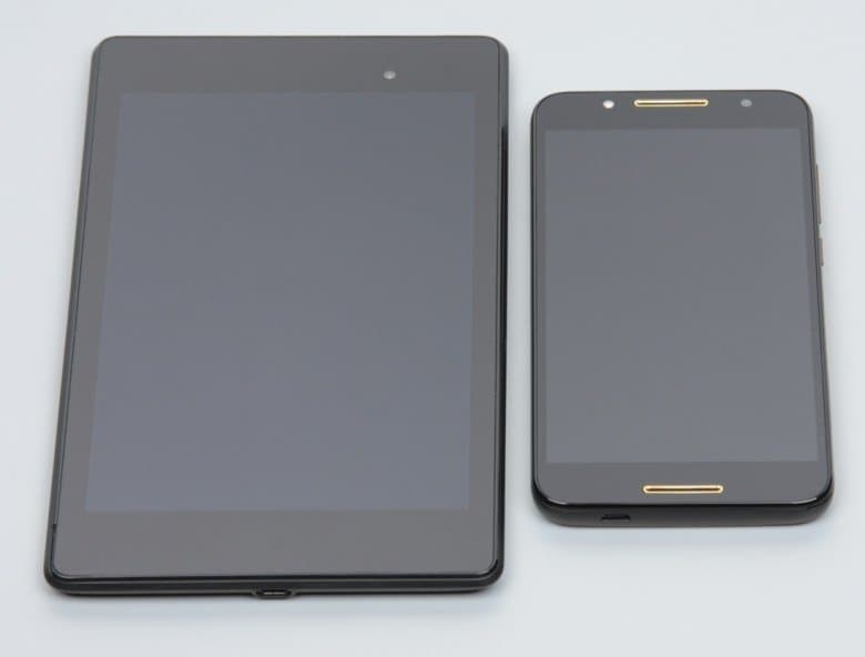 Лицевая поверхность экрана выполнена в виде стеклянной пластины с зеркально-гладкой поверхностью, устойчивой к появлению царапин. Судя по отражению объектов, антибликовые свойства экрана примерно как у экрана Google Nexus 7 (2013) (далее просто Nexus 7). Для наглядности приведем фотографию, на которой в выключенных экранах отражается белая поверхность (слева — Nexus 7, справа — Alcatel A7, далее их можно различать по размеру):