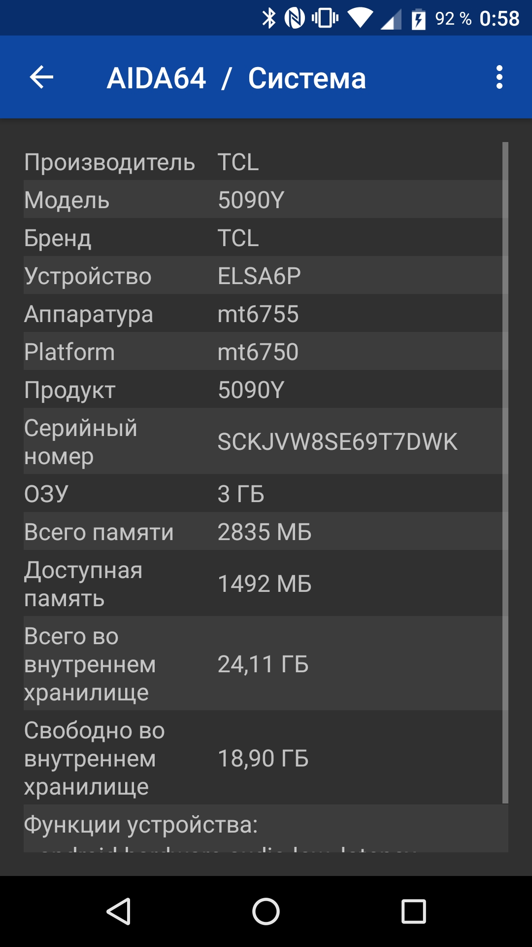Аппаратная платформа строится на однокристальной системе MediaTek MT6750Т, выполненной по 28-нанометровой технологии. В состав этой SoC входят восемь 64-битных ядер ARM Cortex-A53 в двух кластерах: 4 ядра с частотой до 1 ГГц и 4 ядра с частотой до 1,5 ГГц. За обработку графики отвечает двухъядерный GPU Mali-T860 (MP2) с частотой 650 МГц. Объем ОЗУ составляет 3 ГБ, а встроенной флэш-памяти — 32 ГБ. Из них свободно примерно 1,3 ГБ ОЗУ и около 24 ГБ встроенного хранилища.