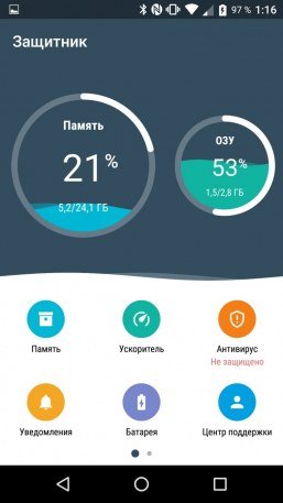 В качестве программной платформы используется Google Android 7.0, без дополнительных оболочек, и найти отличия от чистой Android ОС здесь непросто. Добавлено лишь несколько программ, в их числе комплексный менеджер телефона, называемый здесь «Защитник», хотя эта программа отслеживает не только проникновение вирусов, но и расход памяти, энергопотребление и пр. Работа с жестами ограничена лишь переворотами корпуса.