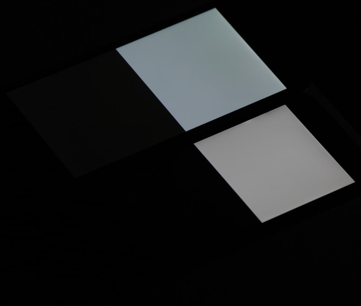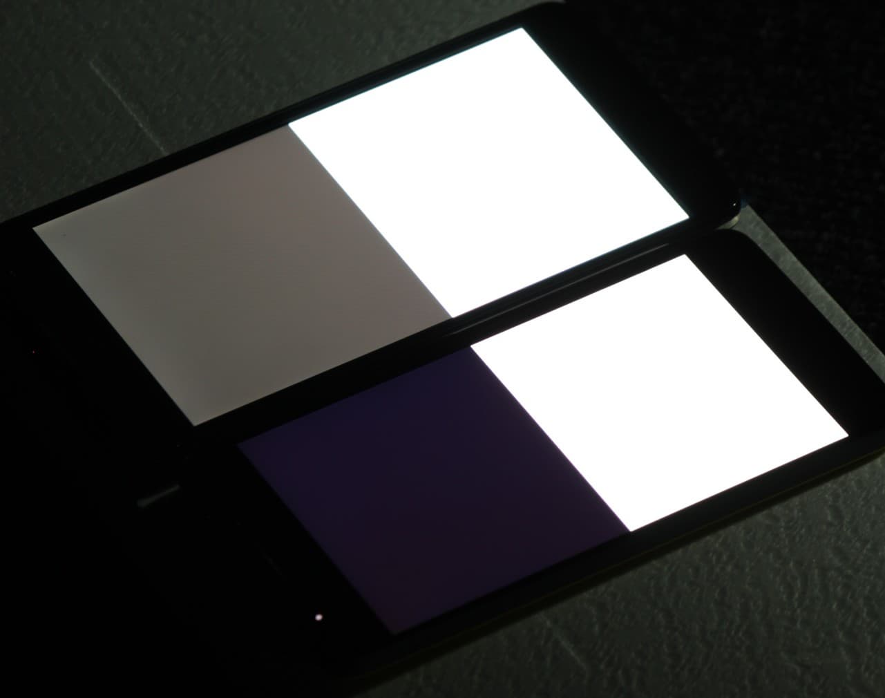 Черное поле при отклонении по диагонали высветляется совсем немного и приобретает красно-фиолетовый оттенок. Фотография с LG D686 для сравнения это показывает (установленная яркость белых участков у обоих экранов одинаковая!):
