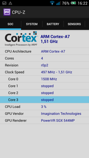 - SoC MediaTek MT6589T, 1,5 ГГц, 4 ядра, ARM Cortex-A7