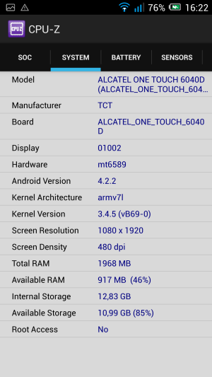 Аппаратная платформа Alcatel One Touch Idol X строится на базе однокристальной системы (SoC) MediaTek MT6589T. Центральный процессор здесь имеет 4 ядра Cortex-A7, работающих на частоте 1,5 ГГц. Помощь в обработке графики ему оказывает видеопроцессор PowerVR SGX 544MP. Оперативной памяти в устройстве предусмотрено 2 ГБ, что вполне современно. Со встроенной памятью у смартфона не густо — 16 ГБ внутренней памяти номинально и всего около 12,7 ГБ свободного флэш-массива в реальности. Расширение памяти с помощью карт microSD смартфон не поддерживает (у модели 6040 такая поддержка имеется). Отчасти проблему решает возможность подключения внешних устройств к порту USB (USB Host, USB OTG). В этом, кстати, состоит существенное отличие Alcatel One Touch Idol X от главного конкурента: Fly Luminor IQ453 не имеет возможностей по подключению внешних устройств.