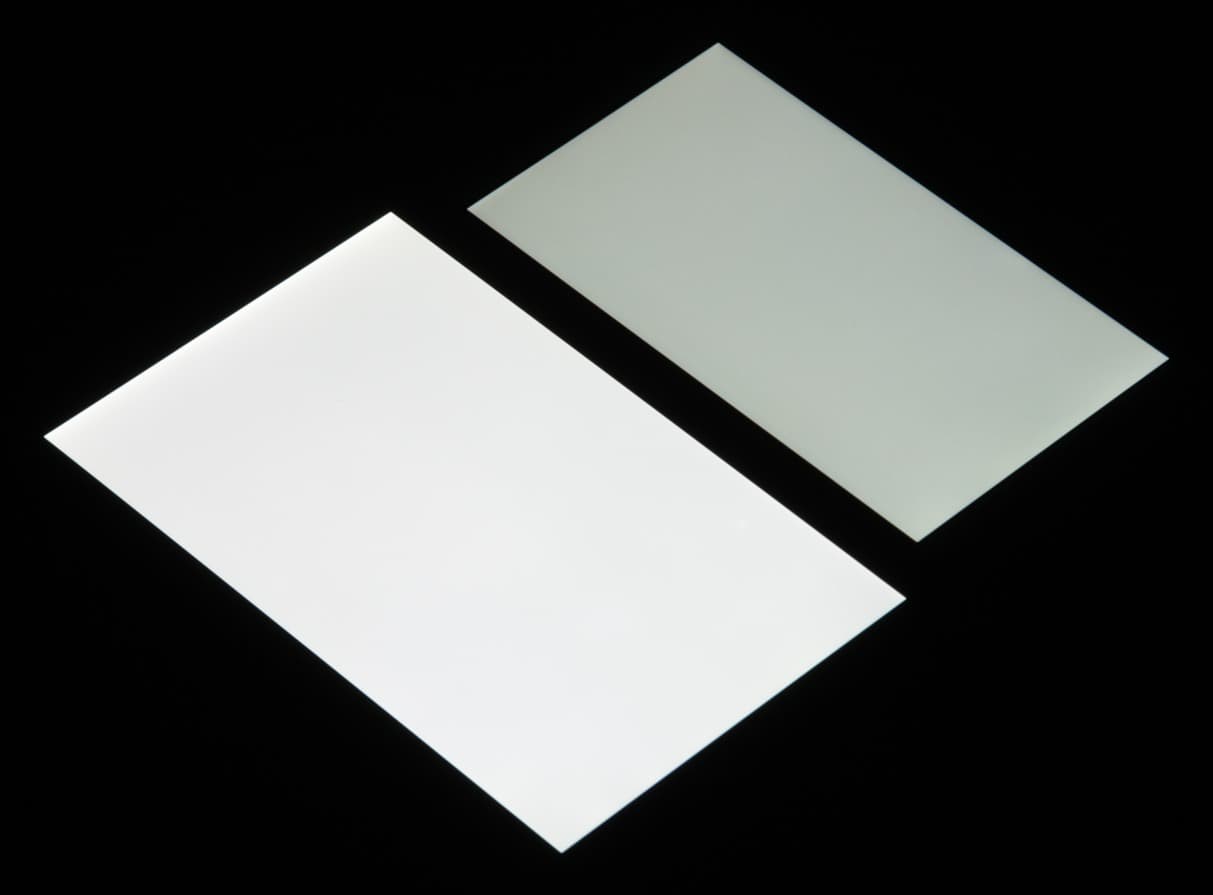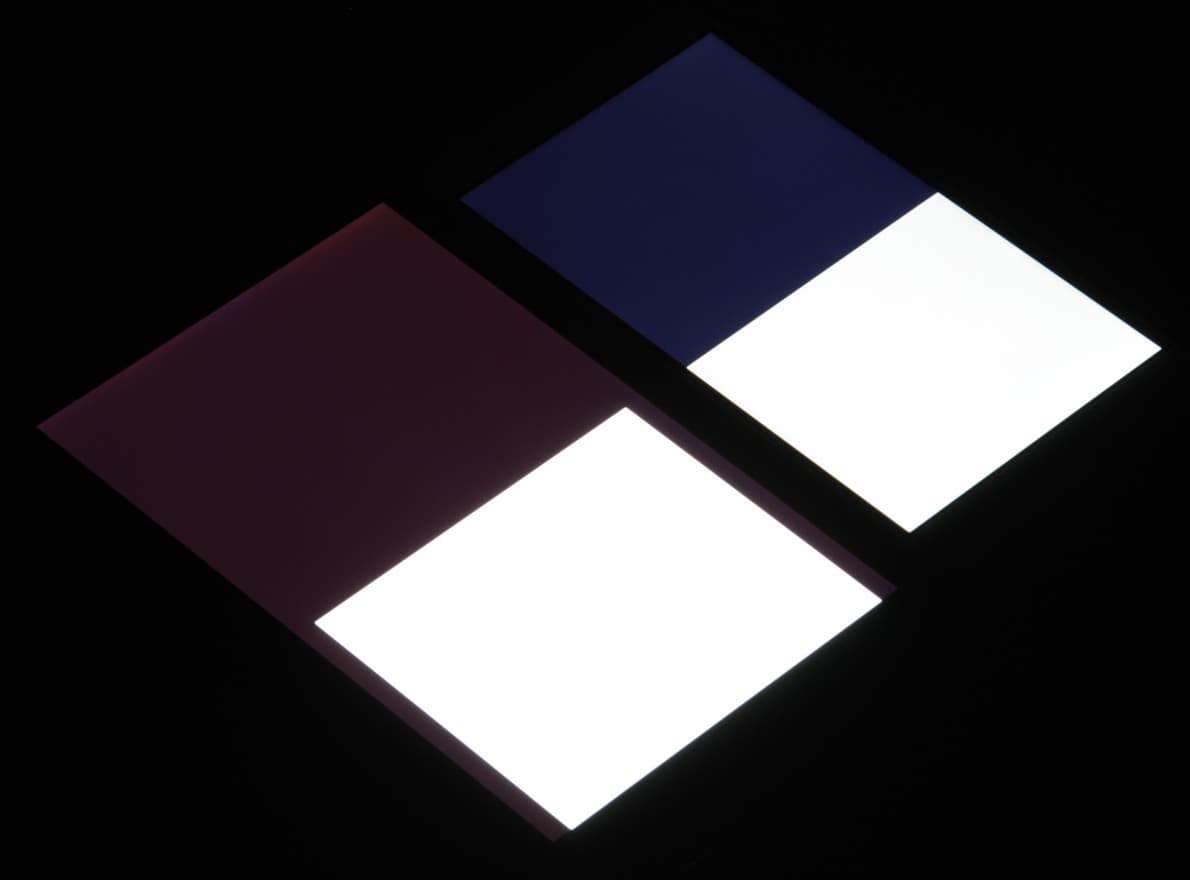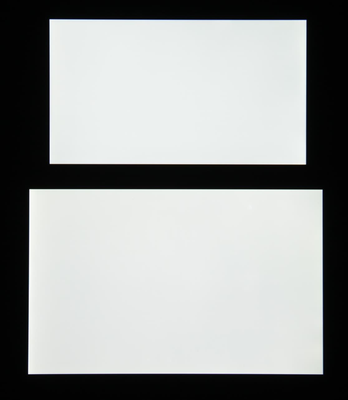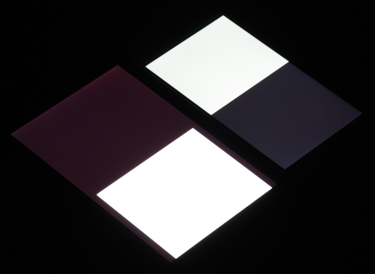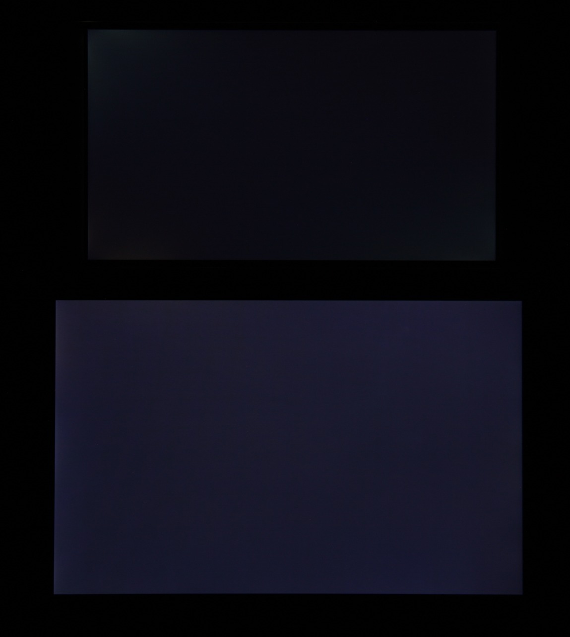 Яркость под углом у экранов уменьшилась (как минимум в 5 раз, исходя из разницы в выдержке), но у Alcatel Pop 4 (6) падение яркости гораздо больше. Черное поле при отклонении по диагонали высветляется слабо, однако это связано с общим снижением яркости, поэтому не является достоинством. Черный цвет под углом имеет слегка синеватый оттенок. Фотографии ниже это демонстрируют (яркость белых участков в перпендикулярном плоскости экранов направлении одинаковая!):