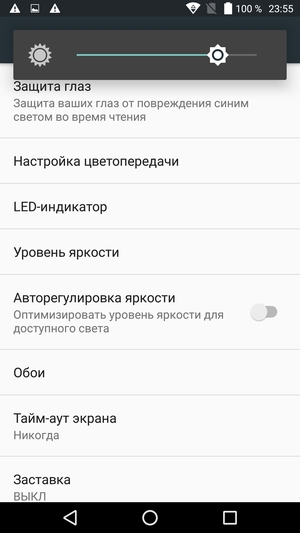 При ручном управлении яркостью и при выводе белого поля во весь экран максимальное значение яркости составило около 400 кд/м², минимальное — 14 кд/м². Максимальная яркость высокая, значит, учитывая отличные антибликовые свойства, читаемость даже в солнечный день вне помещения могла бы быть на хорошем уровне, но это не так, реальная яркость обычно гораздо ниже, объяснения приведены далее по тексту. В полной темноте яркость можно понизить до комфортного значения. В наличии автоматическая регулировка яркости по датчику освещенности (он находится левее глазка фронтальной камеры). В автоматическом режиме при изменении внешних условий освещенности яркость экрана как повышается, так и понижается. Работа этой функции зависит от положения ползунка регулировки яркости. Если он на 100%, то в полной темноте функция автояркости уменьшает яркость до 50 кд/м² (чуть высоковато), при 50% — до 14 кд/м² (нормально), а при 0% — до 2,6 кд/м² (слишком темно). При этом независимо от положения ползунка регулировки яркости в условиях освещенного искусственным светом офиса (около 550 лк) и в очень ярком окружении (соответствует освещению ясным днем вне помещения, но без прямого солнечного света — 20000 лк или немного больше) яркость повышается до 400 кд/м² (что для офиса высоковато). Получается, что функция автоподстройки яркости работает неадекватно. На любом уровне яркости значимая модуляция подсветки отсутствует, поэтому нет и никакого мерцания экрана.