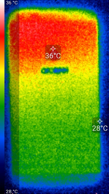 Нагрев больше локализован в верхней части аппарата, что, видимо, соответствует расположению микросхемы SoC. По данным теплокамеры, максимальный нагрев составил 36 градусов (при температуре окружающего воздуха в 24 градуса), это не очень много.