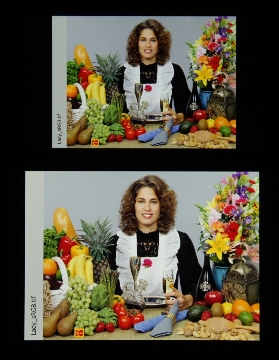 В итоге цвета имеют естественную насыщенность. Баланс оттенков на шкале серого более-менее нормальный, так как цветовая температура не намного выше стандартных 6500 К, и отклонение от спектра абсолютно черного тела (ΔE) составляет примерно 10, что для потребительского устройства считается приемлемым показателем. При этом цветовая температура и ΔE мало изменяются от оттенка к оттенку — это положительно сказывается на визуальной оценке цветового баланса. (Самые темные области шкалы серого можно не учитывать, так как там баланс цветов не имеет большого значения, да и погрешность измерений цветовых характеристик на низкой яркости большая.)