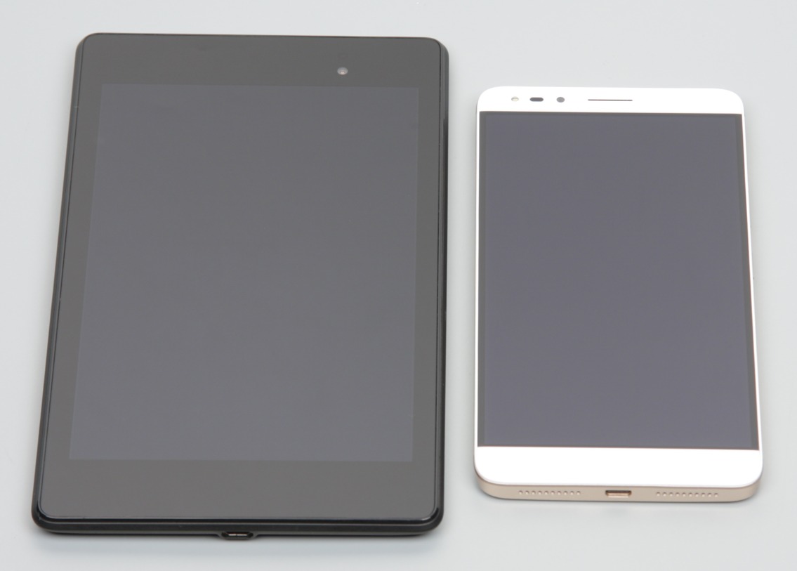 Лицевая поверхность экрана выполнена в виде стеклянной пластины с зеркально-гладкой поверхностью, устойчивой к появлению царапин. Судя по отражению объектов, антибликовые свойства экрана не хуже, чем у экрана Google Nexus 7 (2013) (далее просто Nexus 7). Для наглядности приведем фотографию, на которой в выключенных экранах отражается белая поверхность (слева — Nexus 7, справа — Alcatel Pop 4 (6), далее их можно различать по размеру):