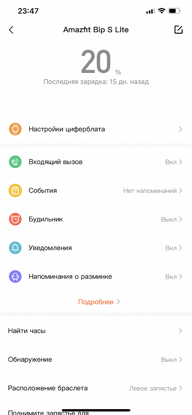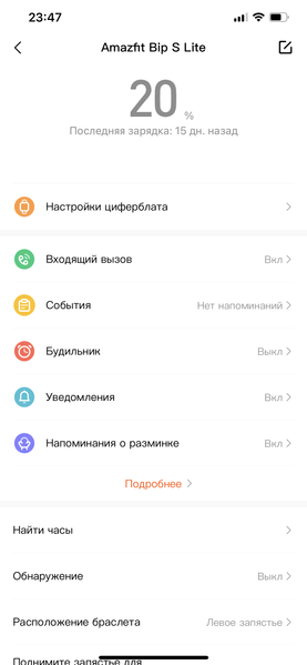 Куда хуже тот факт, что со 100 до 80 процентов часы разряжаются гораздо медленнее, чем с 20 до 0. Поэтому сложно правильно рассчитать время, когда часы необходимо заряжать. Но эту же проблему мы отмечали и у Bip S Lite.