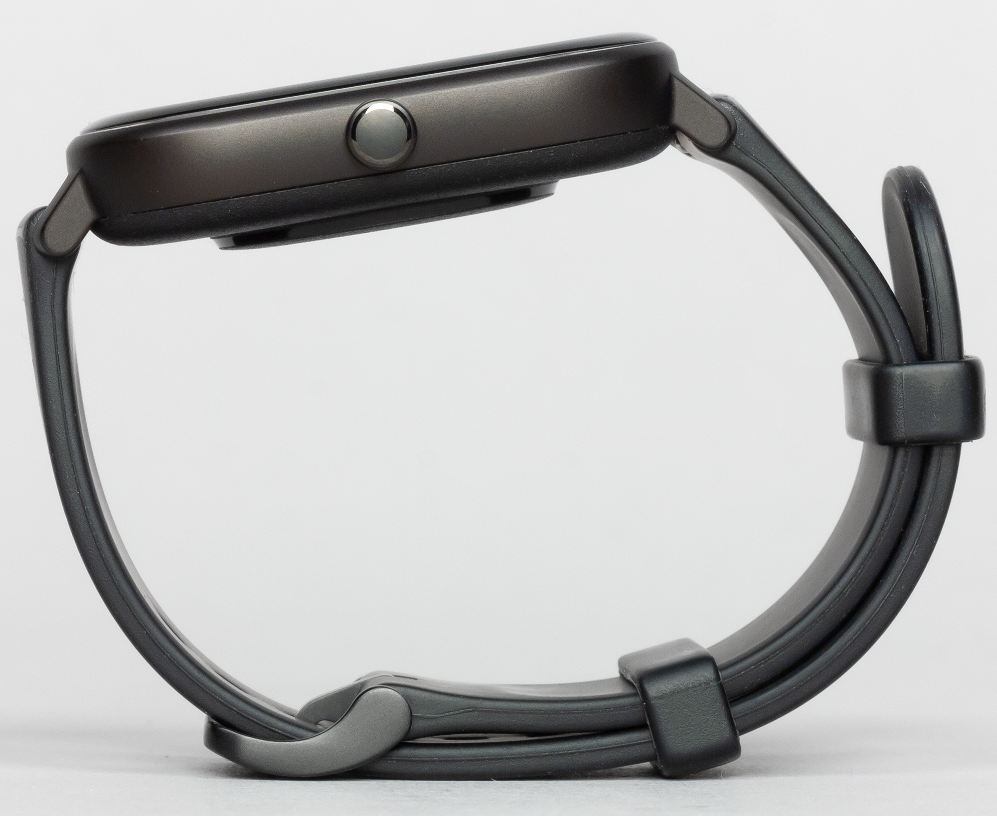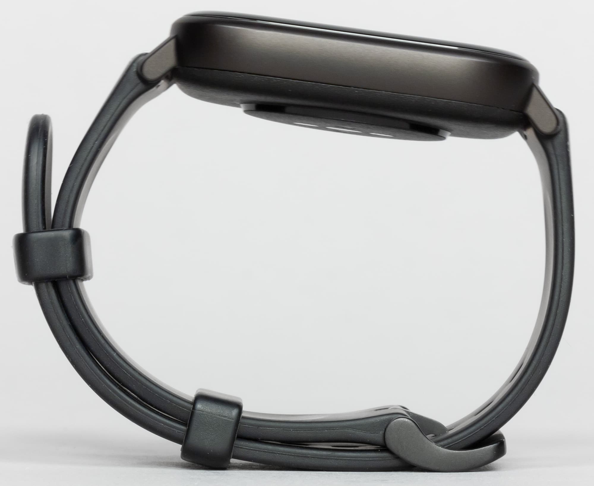 Крепление ремешка к часам — стандартное, на рычажке, который надо оттянуть, чтобы снять половинку ремешка. Ремешок однослойный, гибкий, довольно приятный на ощупь, но, в отличие от Amazfit GTR, абсолютно гладкий.