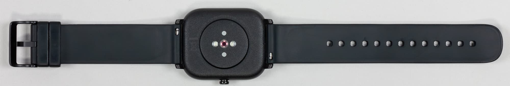 Корпус тоже алюминиевый, но, в отличие от тех же Apple Watch, удешевлен до минимума. Снизу нет стекла, площадка выполнена из пластика со своеобразным шероховатым покрытием, что, с другой стороны, делает часы Amazfit GTS почти невесомыми. Здесь можно увидеть оптические датчики и два металлических контакта pogo.