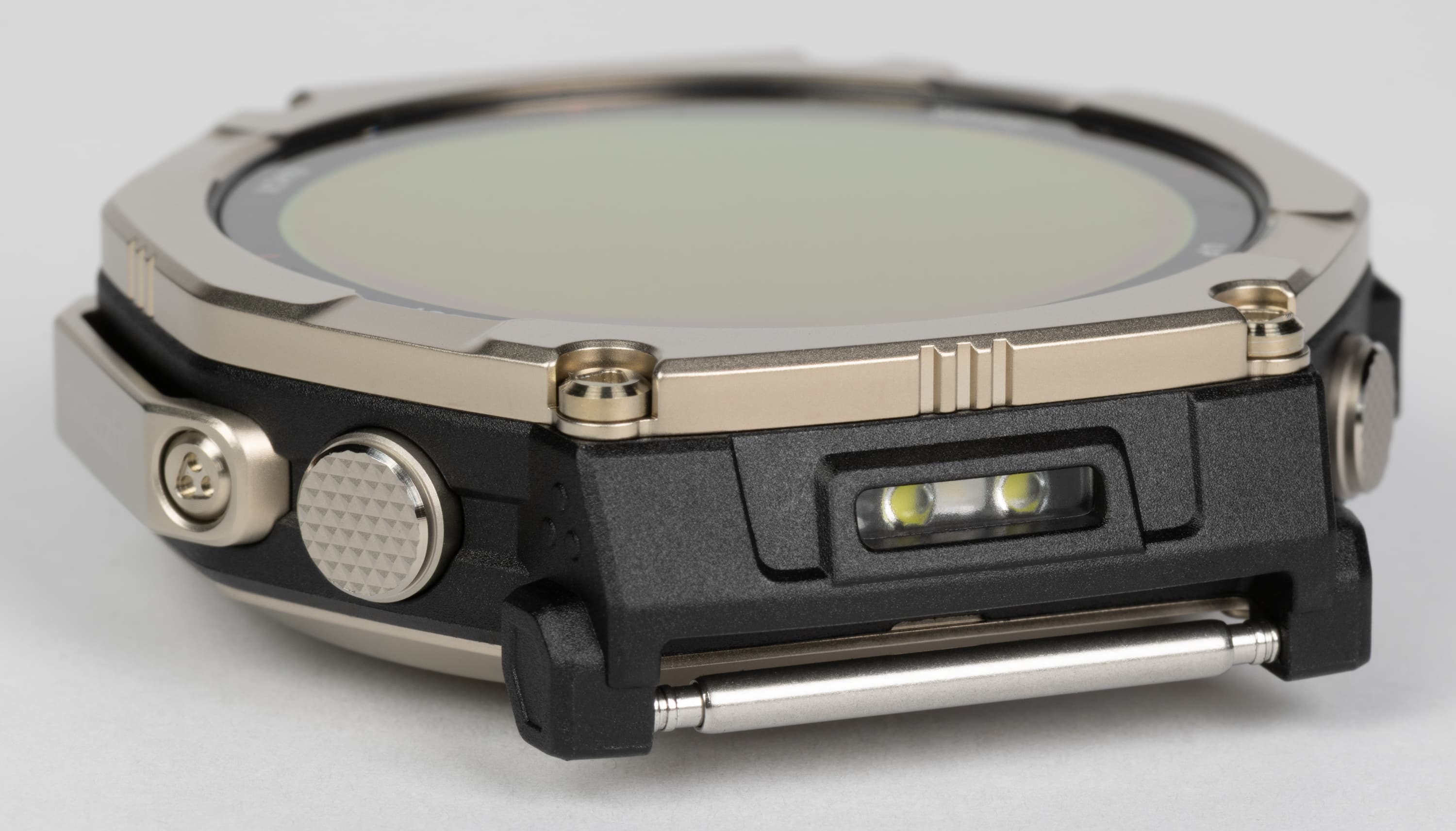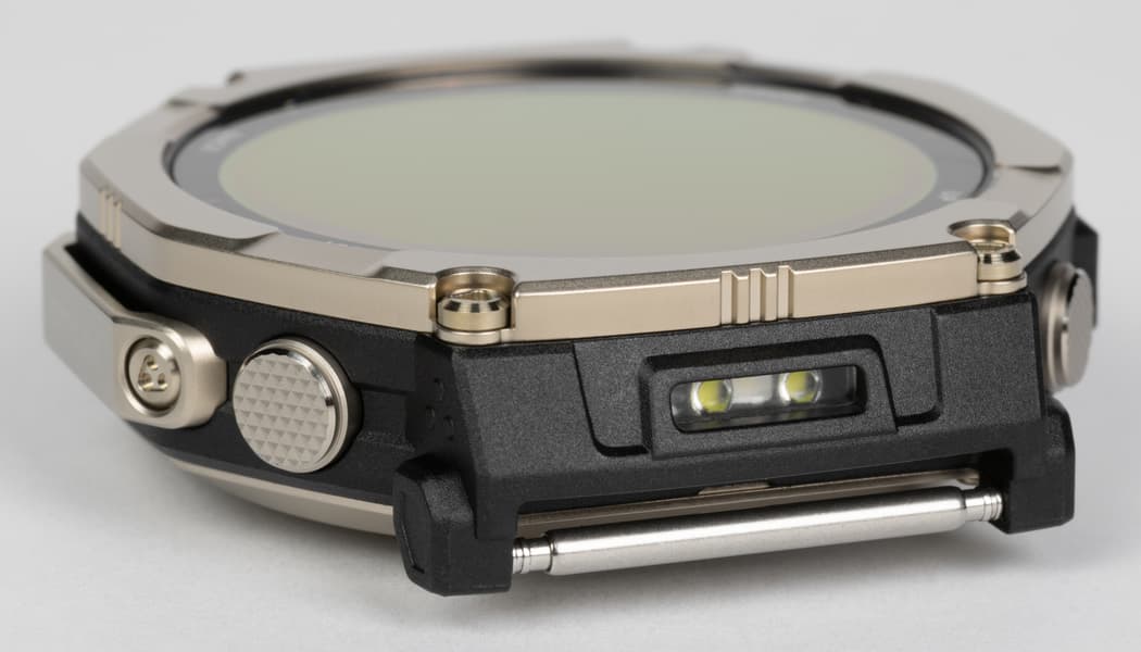Одна из самых интересных особенностей дизайна устройства — встроенный LED-фонарик, причем двухцветный (он может светиться белым и зеленым). Расположен фонарик сверху, над креплением ремешка, активируется через меню быстрого доступа, а последующее управление осуществляется кнопкой на левой стороне — с ее помощью можно менять яркость и цвет фонарика. Не стоит путать эту опцию с «фонариком» в обычных умных часах, где под этим понимается просто включенный на максимальную яркость экран. В полной темноте светящегося экрана хватит максимум на метр, тогда как полноценный LED-фонарик позволяет осветить довольно большое пространство вокруг. Конечно, это не замена налобного фонаря, но, например, в походе он может быть очень актуален.