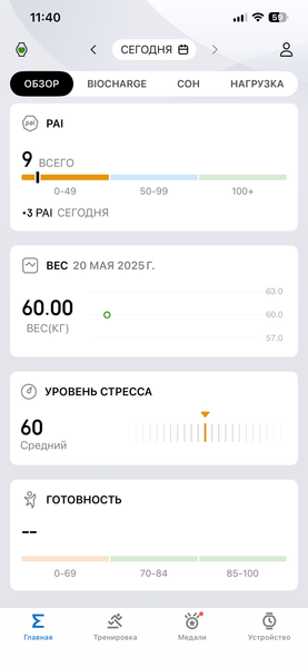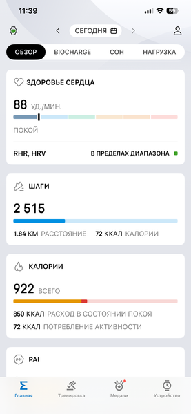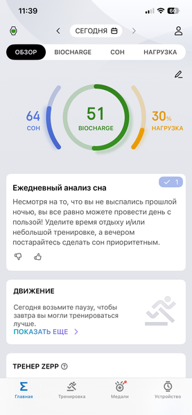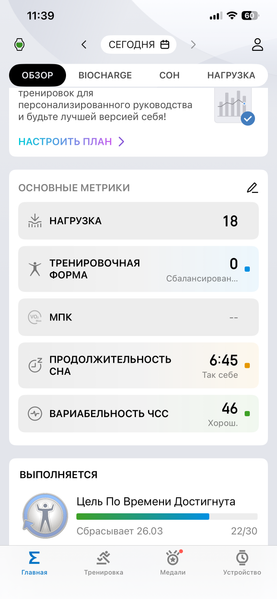 Ключевой параметр повседневного физического состояния здесь называется Biocharge. Суть в том, что часы «наблюдают» несколько дней за пользователем, фиксируют его пульс, сон, активность и в итоге делают некий обобщенный вывод о том, насколько у него «заряжена батарейка».