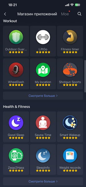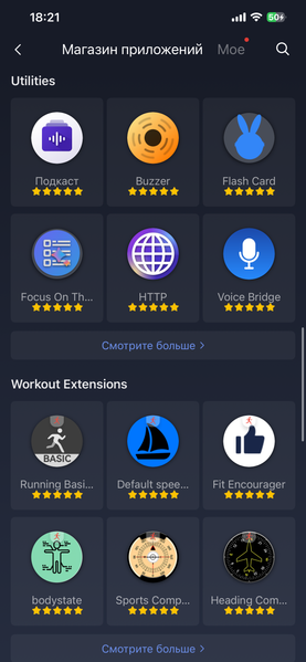 Важная особенность часов — поддержка сторонних приложений, причем это в равной степени работает в связке с iOS и с Android. Выбор приложений очень широк. Точно посчитать их количество непросто, но по ощущению, их больше, чем у часов Huawei. Сравнивать с Apple сложнее, так как там выбор тоже велик.