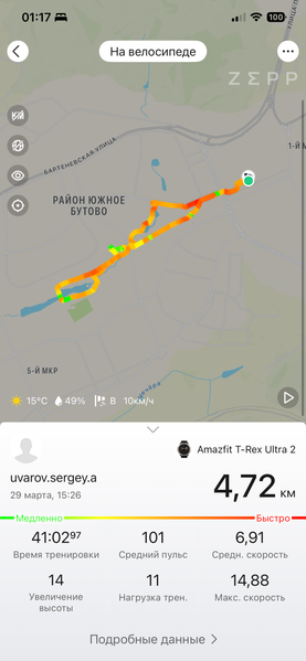 Что касается обычных тренировок (а их выбор очень широк — 180 режимов), то здесь мы решили опробовать велоспорт, и, надо заметить, у нас были смешанные впечатления. С одной стороны, трек по карте был построен очень точно. Видно, что с геопозиционированием у модели всё в порядке. С другой стороны, набор сведений по итогам тренировки меньше, чем у некоторых конкурентов.