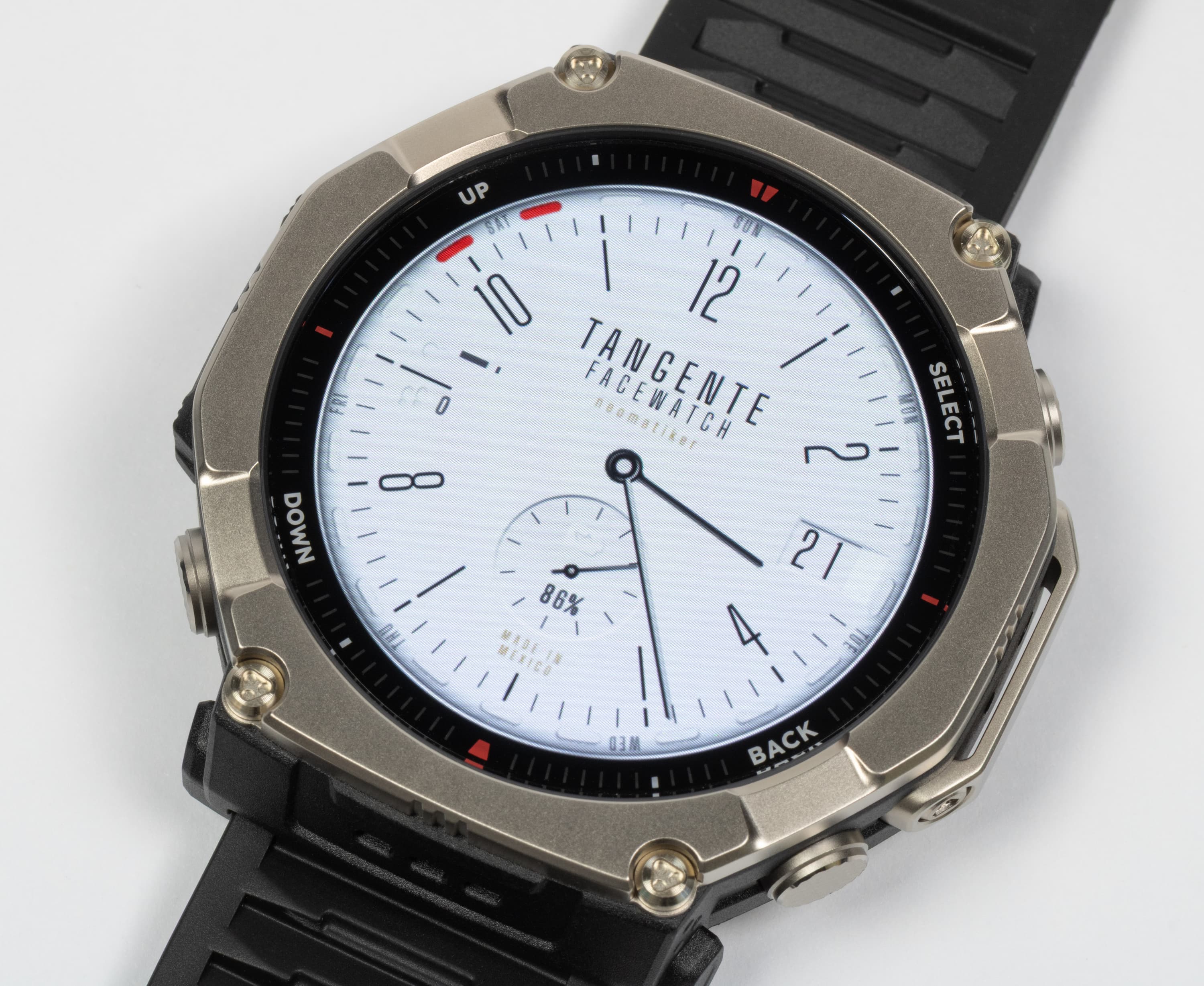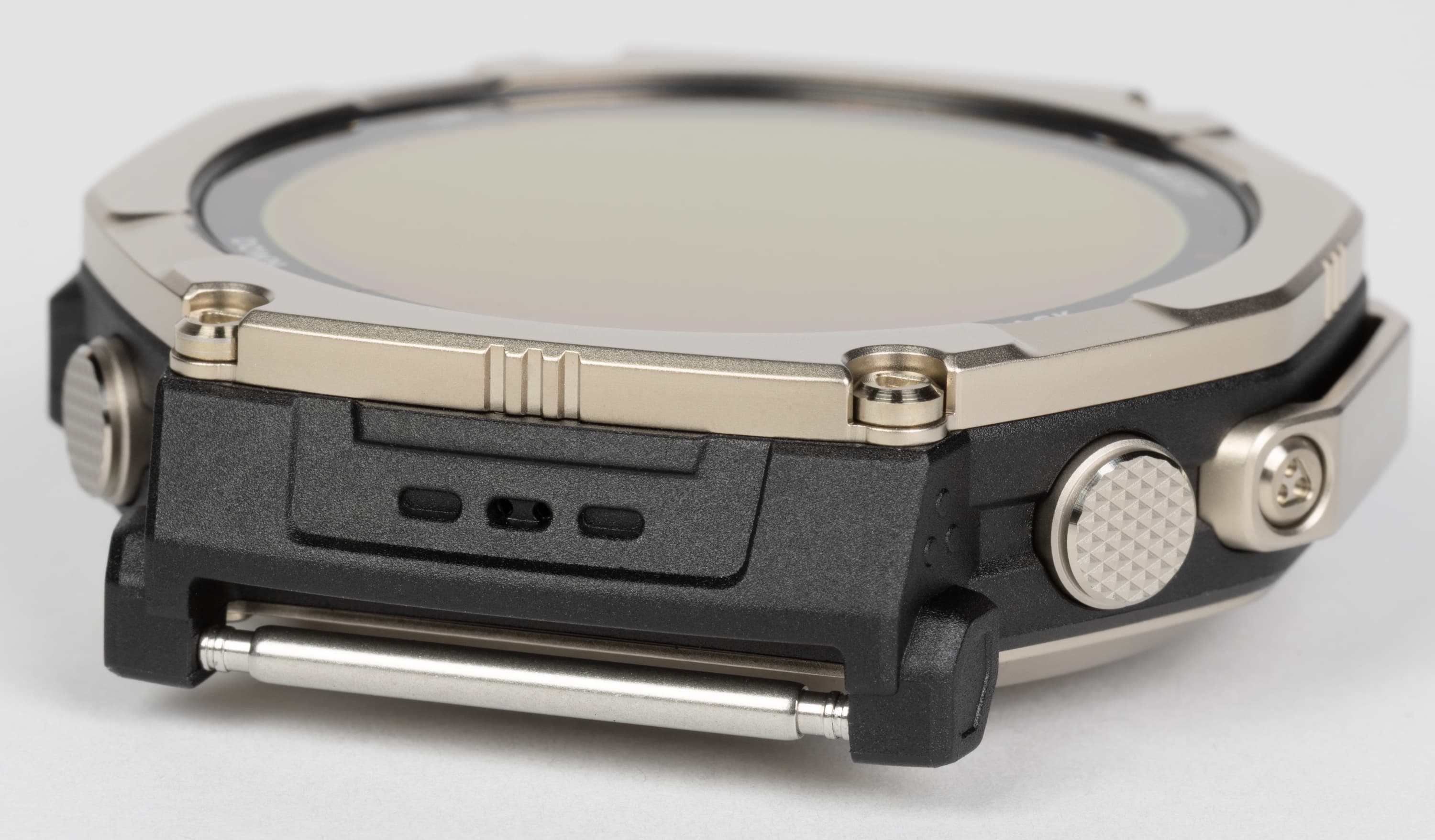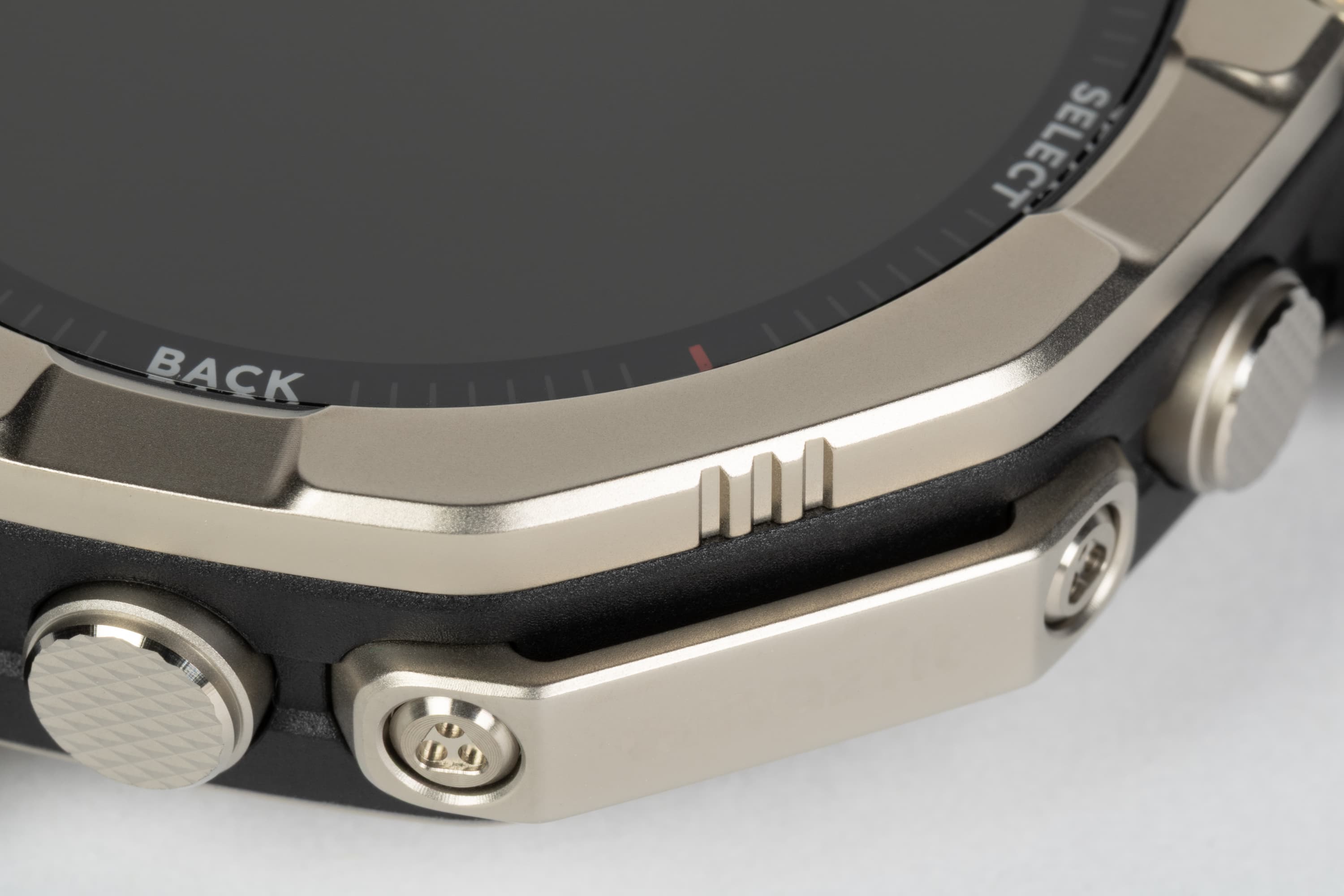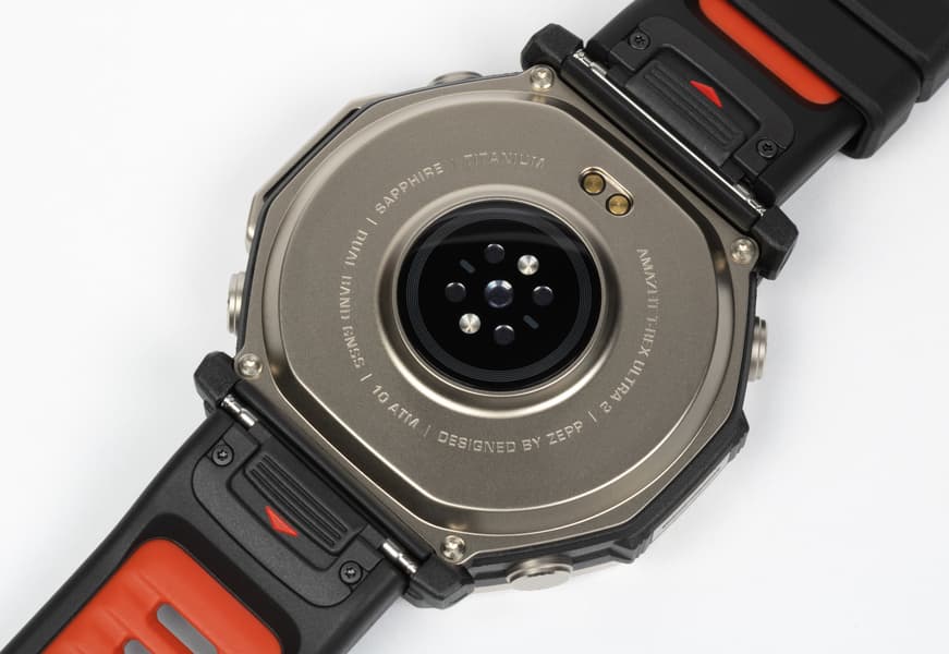 Обратим внимание, что даже тыльная сторона, которая у подавляющего большинства умных часов выполнена из пластика или аналогичных материалов, здесь титановая. Как и прочие металлические элементы.