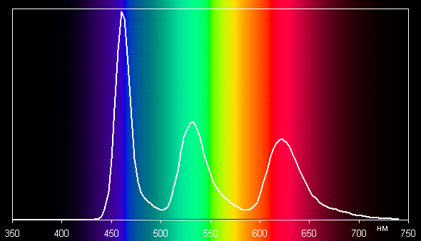 Спектры типичны для OLED — области первичных цветов хорошо разделены и имеют вид относительно узких пиков: