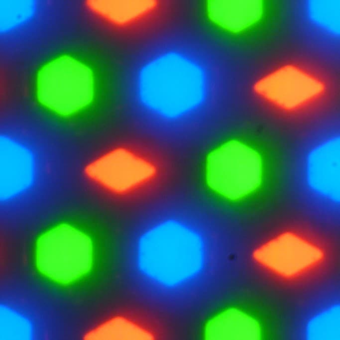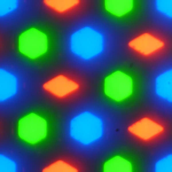 В этом экране используется OLED-матрица — активная матрица на органических светодиодах. Полноцветное изображение создается с помощью субпикселей трех цветов — красного (R), зеленого (G) и синего (B) в равном количестве, что подтверждается фрагментом микрофотографии: