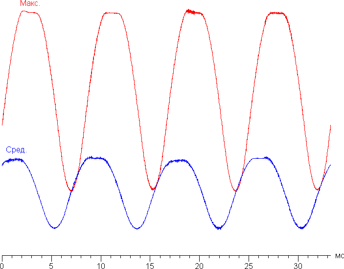 На графике зависимости яркости от времени определяется значимая модуляция с частотой 120 Гц, а при желании и особенно в случае очень низкой яркости на некоторых изображениях при быстром движении часов относительно глаз можно выявить стробоскопический эффект. Однако по факту при обычном использовании мерцание не обнаруживается, так как фаза модуляции различается по площади экрана и скважность на рабочем уровне яркости невысокая. На рисунке ниже приведены зависимости яркости (вертикальная ось) от времени (горизонтальная ось) для двух уровней яркости: