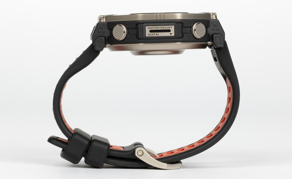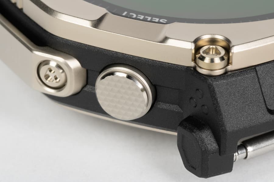 Пластик всё же есть, но он виден только на гранях и у крепления ремешка. И это очень твердый пластик, его крайне сложно поцарапать или как-то повредить. Производитель указывает на защиту по стандарту MIL-STD-810H, так что падения, удары при походах и занятиях спортом и тому подобные воздействия часам нипочем. К тому же, стекло сапфировое, а следовательно — особо прочное.