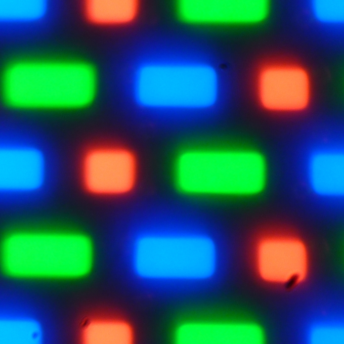 В этом экране используется матрица AMOLED — активная матрица на органических светодиодах. Полноцветное изображение создается с помощью субпикселей трех цветов — красного (R), зеленого (G) и синего (B) в равном количестве, что подтверждается фрагментом микрофотографии: