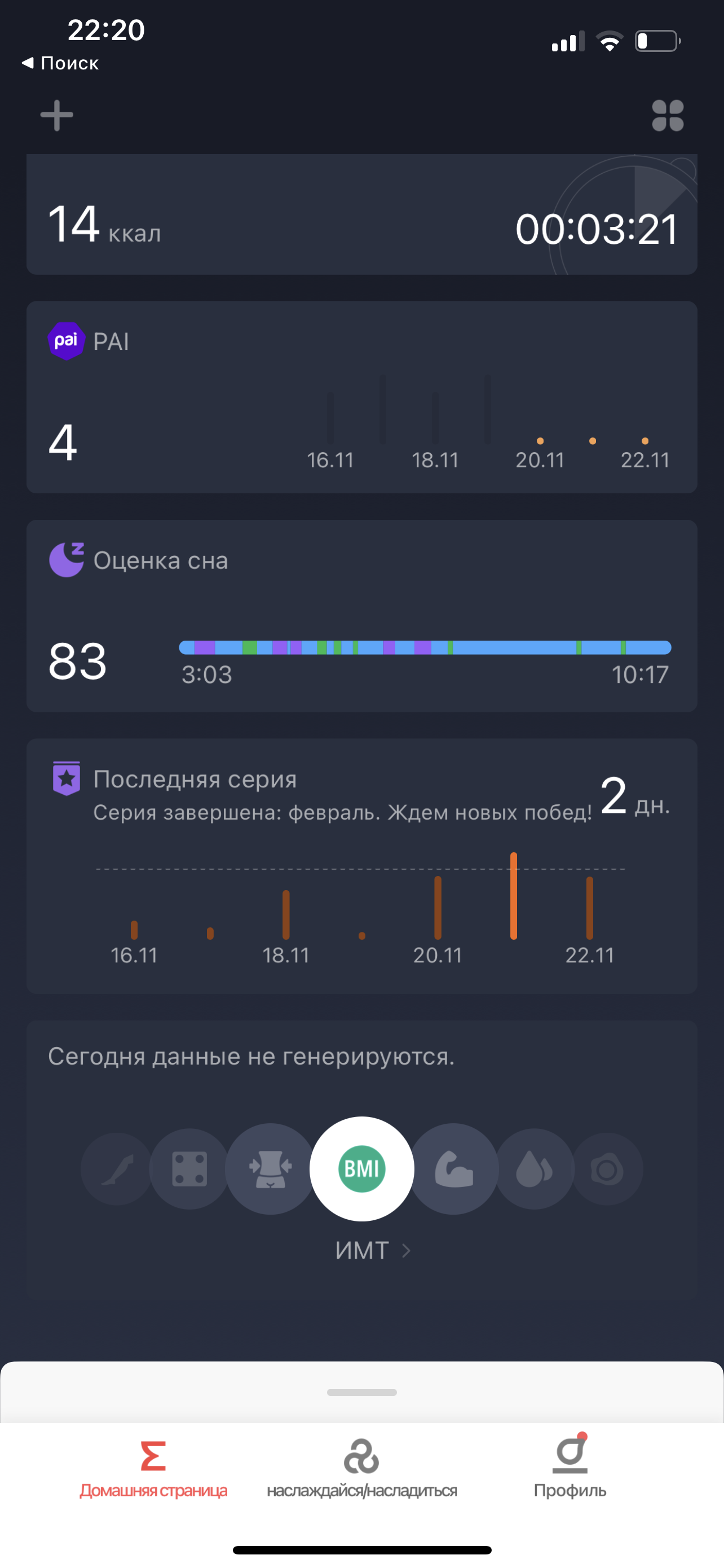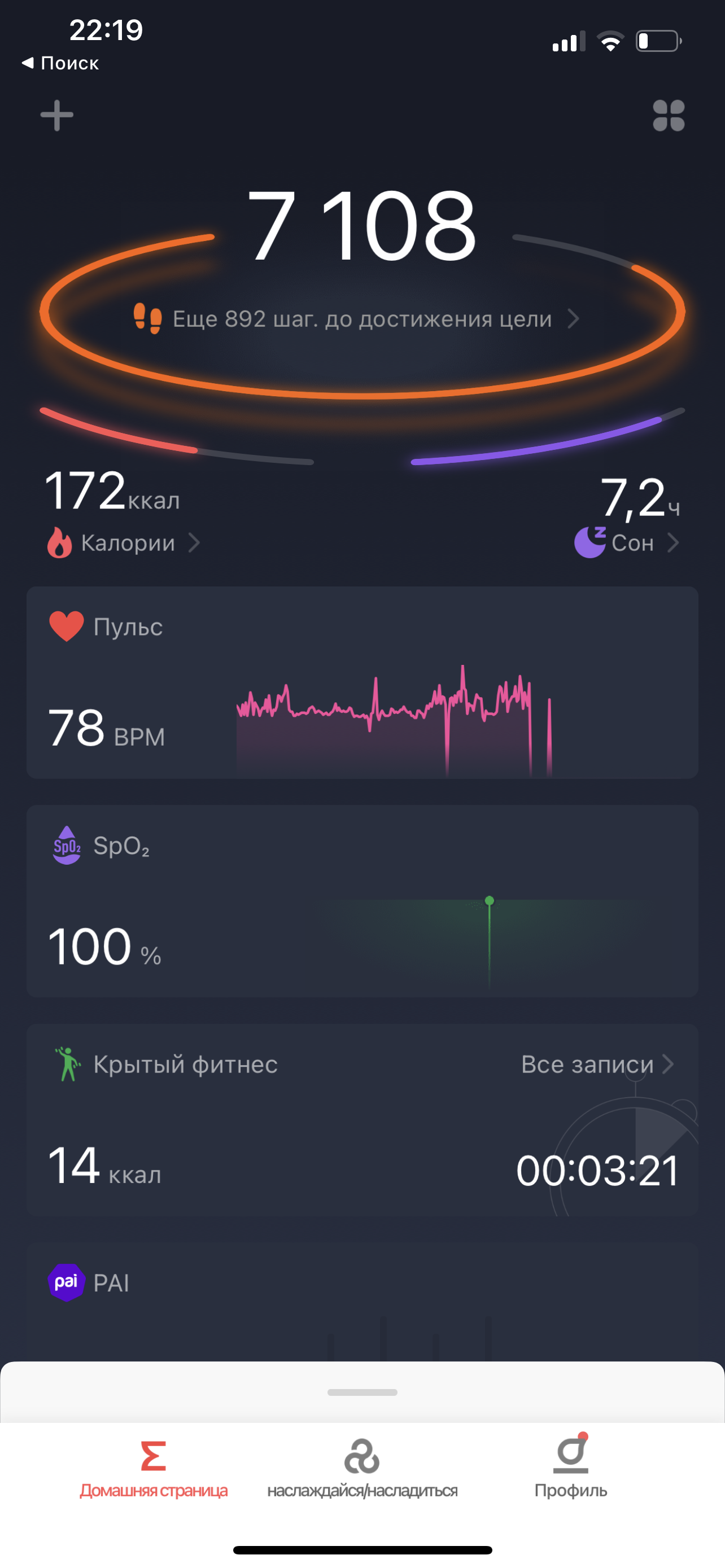 Зато вроде бы может фиксировать качество дыхания во время сна, если активировать соответствующую опцию, но на момент тестирования она была в beta-режиме и в статистике по сну почему-то не отображалась.