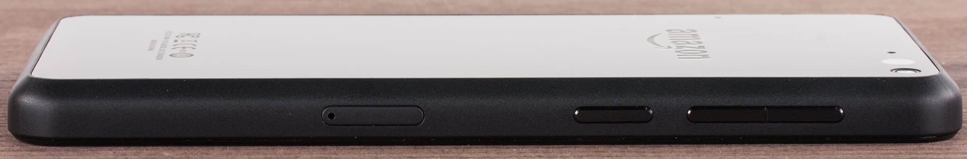 Боковая грань смартфона выполнена из прорезиненного пластика, что, теоретически, делает устройство более устойчивым к ударам. Кнопки регулировки громкости вынесены на левую грань. Такие вытянутые клавиши удобны для большого пальца, который ложится вдоль них. Поэтому большинство производителей, рассчитывая на правшей, устанавливают кнопки на правой грани. Инженеры Amazon, наоборот, поступают нестандартно, так что у левшей смартфон будет сидеть в руке гораздо удобней.