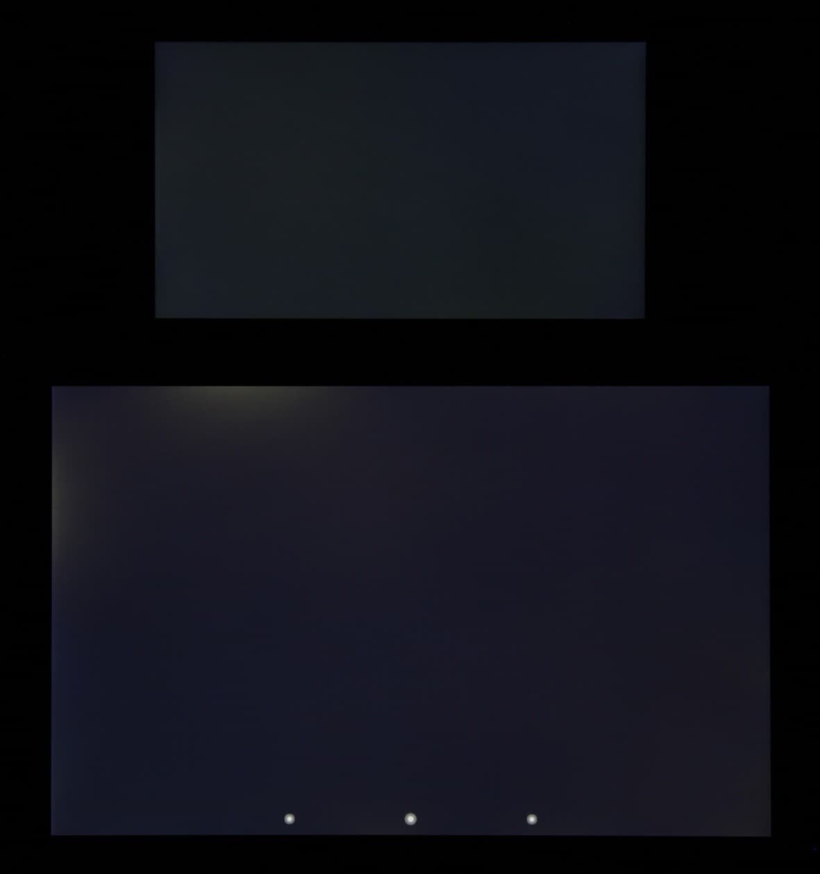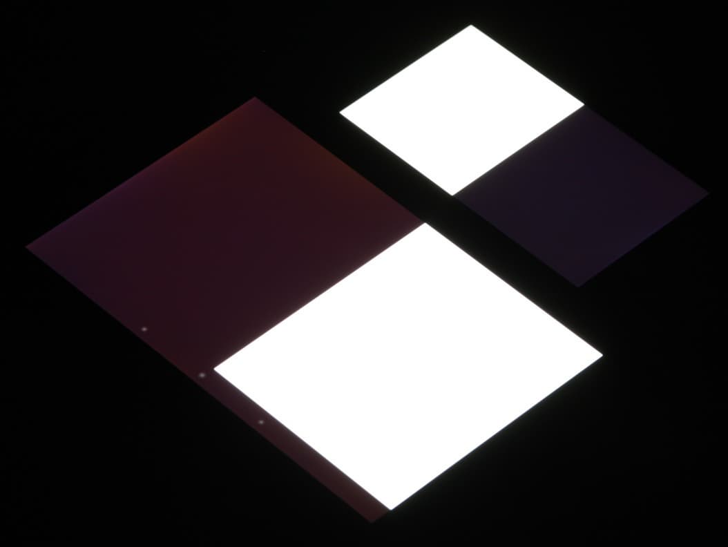 Яркость под углом у экранов уменьшилась (как минимум в 5 раз, исходя из разницы в выдержке), но в случае Amazon Fire Phone падение яркости чуть больше. Черное поле при отклонении по диагонали высветляется слабо и приобретает легкий фиолетовый или красно-фиолетовый оттенок. Фотографии ниже это демонстрируют (яркость белых участков в перпендикулярном плоскости экранов направлении примерно одинаковая!):