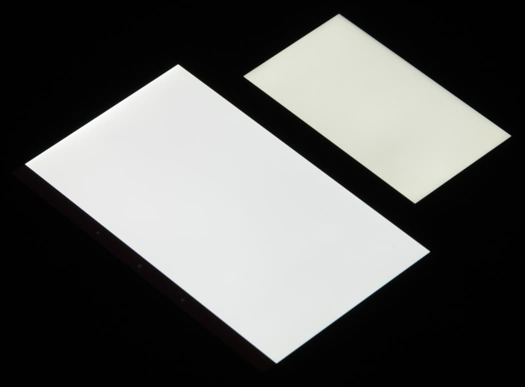 Лицевая поверхность экрана выполнена в виде стеклянной пластины с зеркально-гладкой поверхностью, устойчивой к появлению царапин. Судя по отражению объектов, антибликовые свойства экрана не хуже, чем у экрана Google Nexus 7 (2013) (далее просто Nexus 7). Для наглядности приведем фотографию, на которой в выключенных экранах отражается белая поверхность (слева — Nexus 7, справа — Amazon Fire Phone, далее их можно различать по размеру):