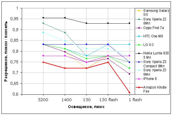 Экран у Amazon Fire Phone все же немного светлее (яркость по фотографиям 123 против 113 у Nexus 7). Двоение отраженных объектов в экране Amazon Fire очень слабое, это свидетельствует о том, что между слоями экрана (конкретнее между внешним стеклом и поверхностью ЖК-матрицы) нет воздушного промежутка (экран типа OGS — One Glass Solution). За счет меньшего числа границ (типа стекло-воздух) с сильно различающимися коэффициентами преломления такие экраны лучше смотрятся в условиях сильной внешней засветки, но вот их ремонт в случае потрескавшегося внешнего стекла обходится гораздо дороже, так как менять приходится экран целиком. На внешней поверхности экрана есть специальное олеофобное (жироотталкивающее) покрытие (эффективное, примерно как у Nexus 7), поэтому следы от пальцев удаляются существенно легче, а появляются с меньшей скоростью, чем в случае обычного стекла.