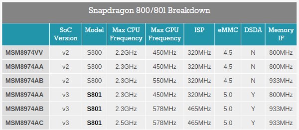 | SoC | Qualcomm Snapdragon 800 (4 ядра Krait 400) @2,2 ГГц | Qualcomm Snapdragon 801 (4 ядра Krait 400) @2,5 ГГц | Qualcomm Snapdragon 801 (4 ядра Krait 400) @2,0 ГГц | Qualcomm Snapdragon 400 (4 ядра ARM Cortex-A7) @1,2 ГГц | Apple A8 (2 ядра, 64-битная архитектура ARMv8-A) @1,4 ГГц |