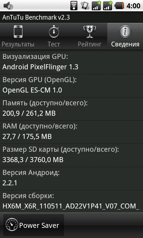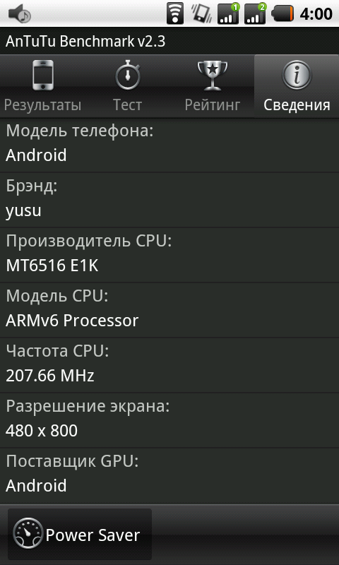 Вот чем аппарат нас разочаровал, так это своей производительностью. Частота работы одноядерного процессора MediaTek 6516 — всего 416 ГГц. Интересно, что бенчмарк AnTuTu Benchmark v2.3 определяет частоту CPU как 207,66 МГц, а объем оперативной памяти — как 175,5 МБ.