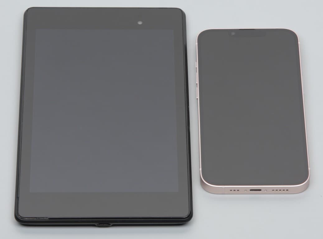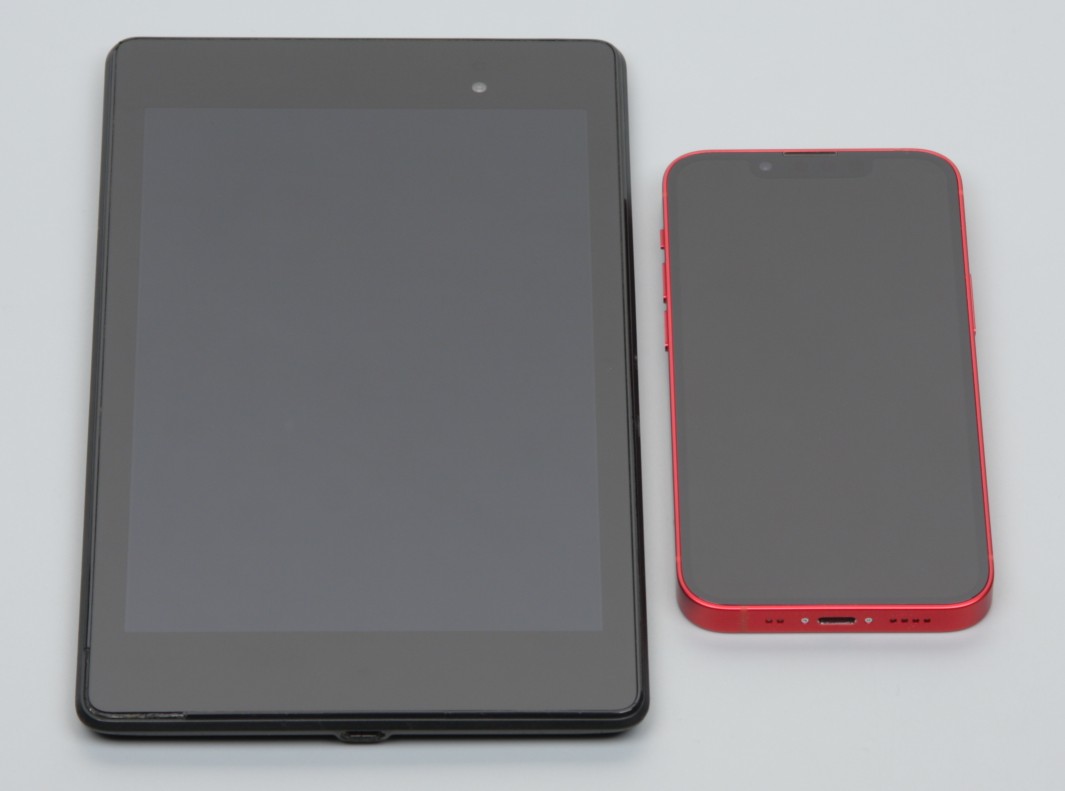 Лицевая поверхность экрана выполнена в виде стеклянной пластины с зеркально-гладкой поверхностью, устойчивой к появлению царапин. Судя по отражению объектов, антибликовые свойства экрана чуть лучше, чем у экрана Google Nexus 7 (2013) (далее просто Nexus 7). Для наглядности приведем фотографию, на которой в выключенных экранах отражается белая поверхность (слева — Nexus 7, справа — Apple iPhone 13 mini, далее их можно различать по размеру):