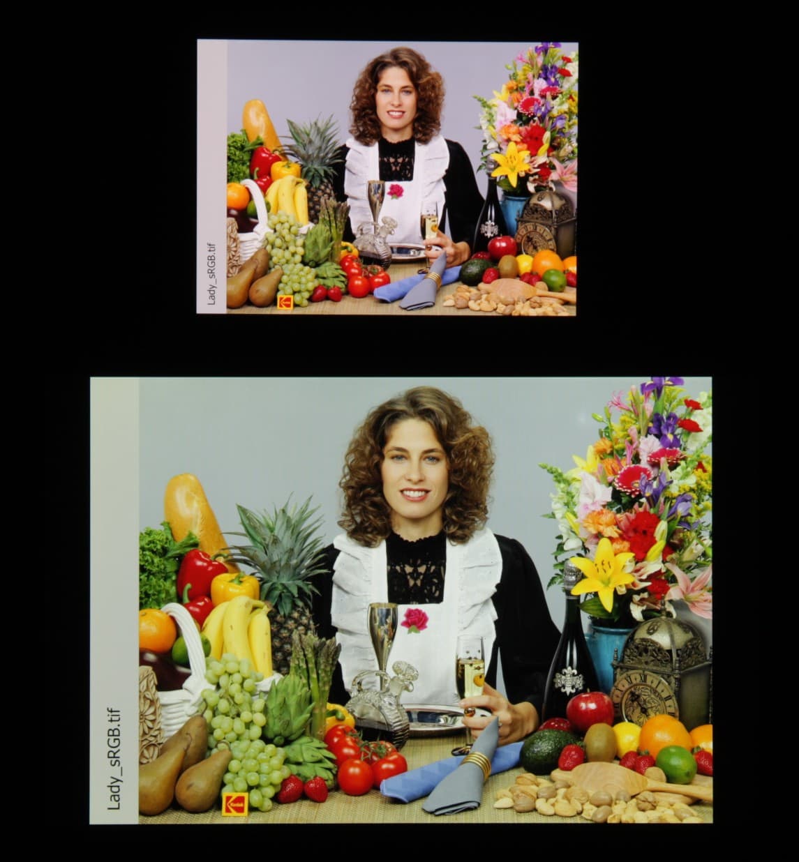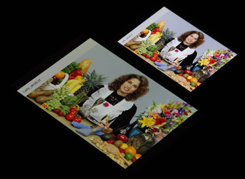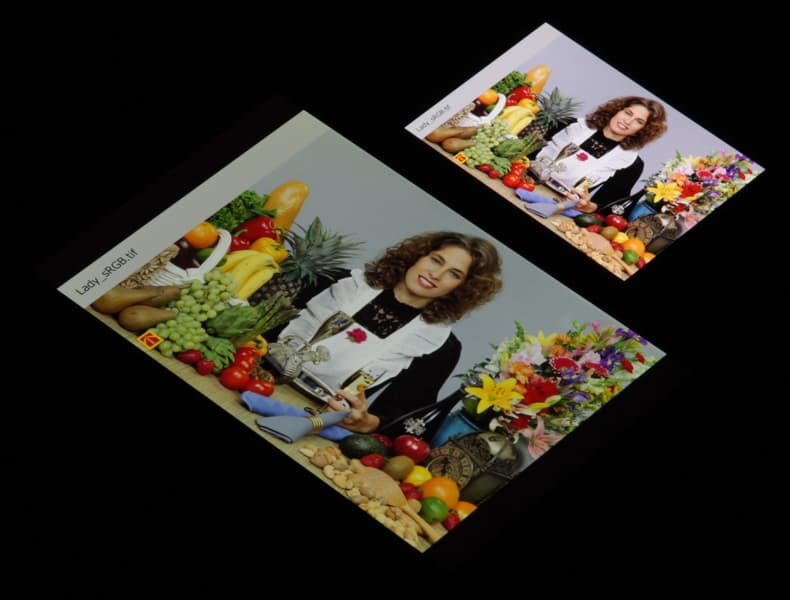 Это относится к тем изображениям, в которых прописан профиль sRGB или не прописано вообще никакого профиля. Однако родным для современных топовых устройств Apple является цветовое пространство Display P3 с немного более насыщенными зеленым и красным цветами. Пространство Display P3 основано на SMPTE DCI-P3, но имеет точку белого D65 и гамма-кривую с показателем примерно 2,2. Кроме того, производитель заявляет, что начиная с iOS 9.3 на системном уровне поддерживается управление цветом, это облегчает приложениям под iOS задачу правильно выводить на экран изображения с прописанным цветовым профилем. Действительно, дополнив тестовые изображения (файлы JPG и PNG) профилем Display P3, мы получили цветовой охват шире sRGB (вывод в Safari):