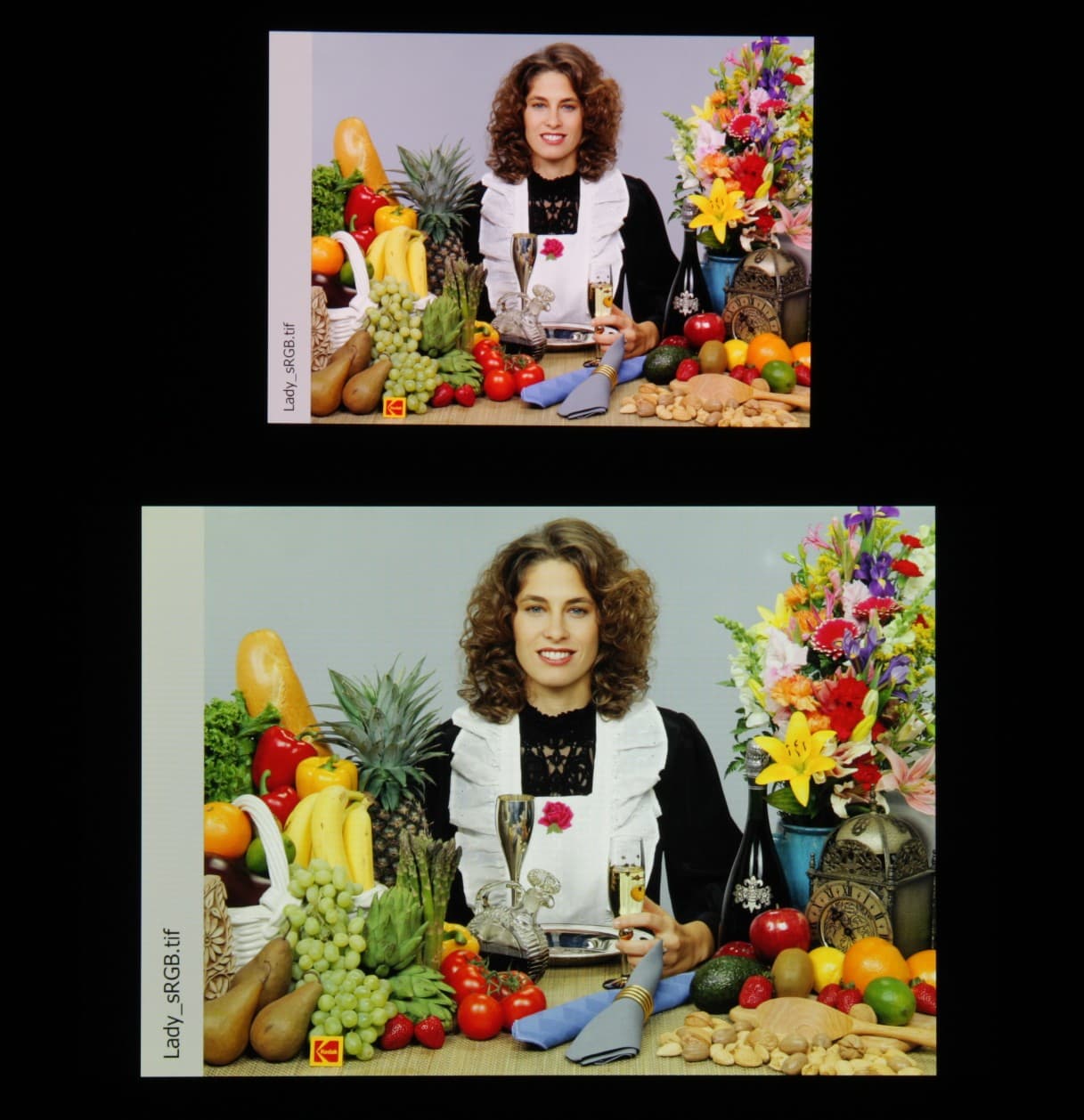 Баланс оттенков на шкале серого отличный, так как цветовая температура близка к стандартным 6500 К, а отклонение от спектра абсолютно черного тела (ΔE) меньше 3, что для потребительского устройства считается великолепным показателем. При этом цветовая температура и ΔE мало изменяются от оттенка к оттенку — это положительно сказывается на визуальной оценке цветового баланса. (Самые темные области шкалы серого можно не учитывать, так как там баланс цветов не имеет большого значения, да и погрешность измерений цветовых характеристик на низкой яркости большая.)