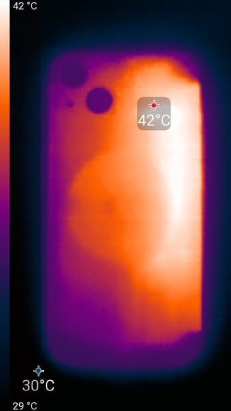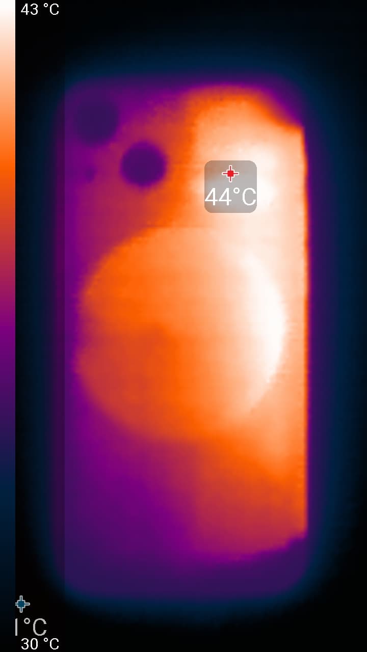 Нагрев больше в левой части аппаратов, что, видимо, соответствует расположению микросхемы SoC. По данным теплокамеры, максимальный нагрев составил 42 градуса у iPhone 13 и 44 градуса у iPhone 13 mini (при температуре окружающего воздуха в 24 градуса), это не очень высокий нагрев.
